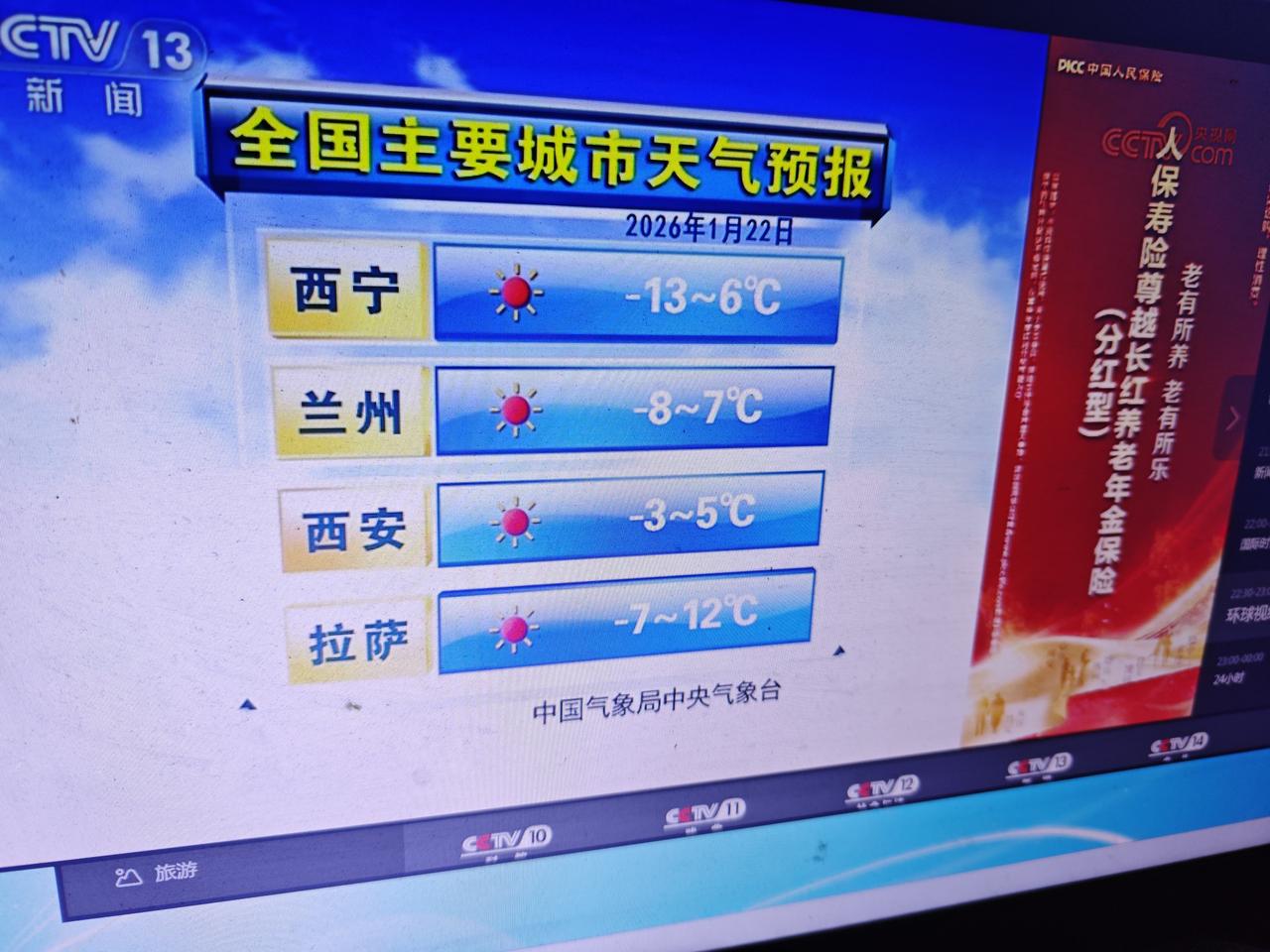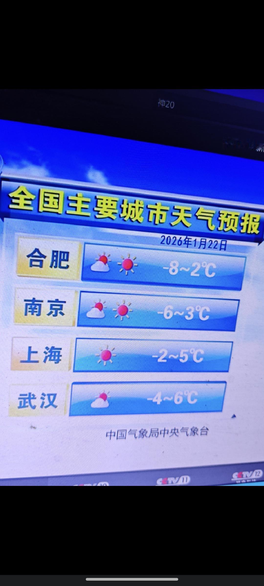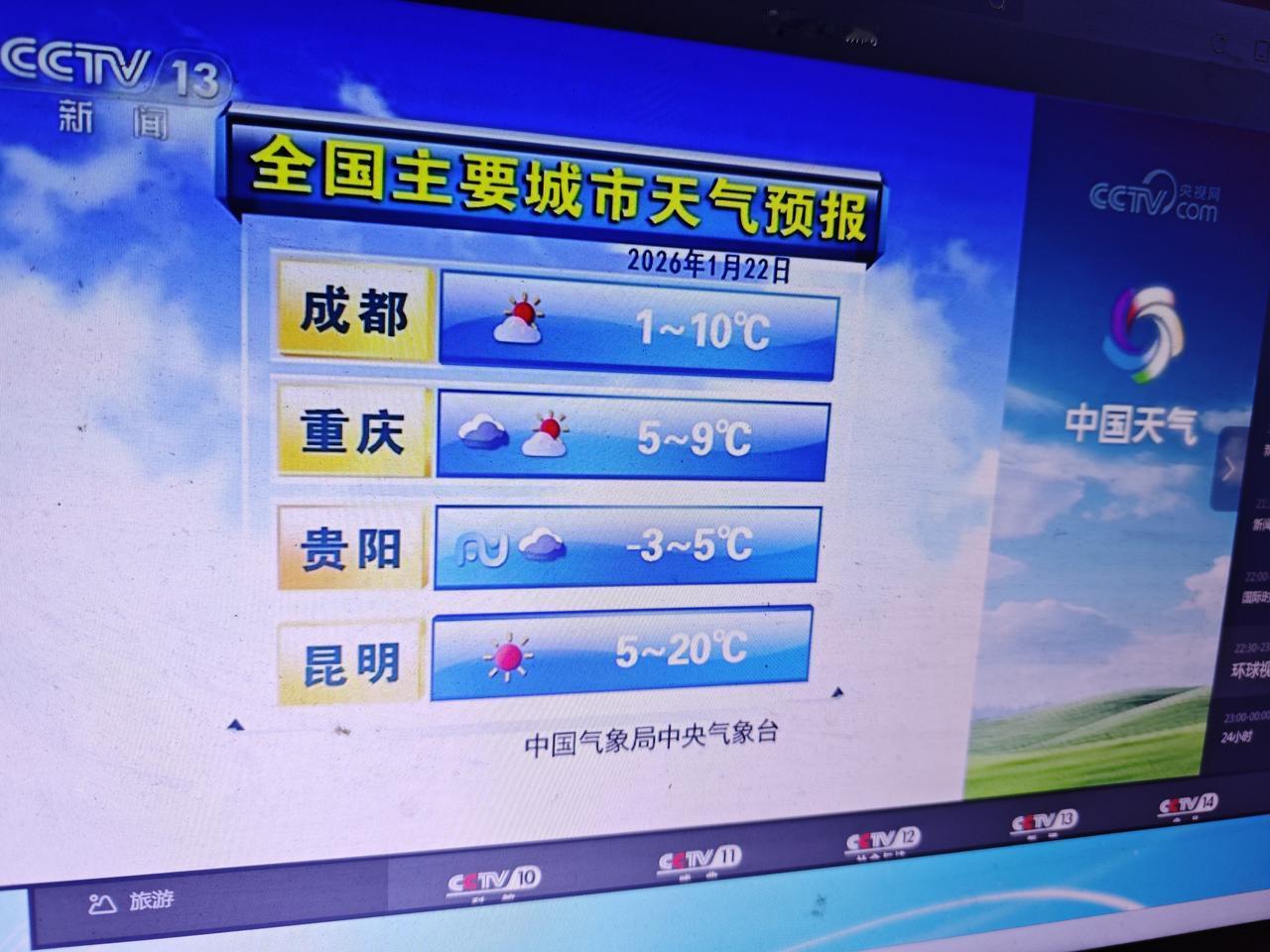 2,3,4图是最冷的4九天,陕西,重庆,上海等城市同一天的天气预报,重庆的最低温度与春城昆明一样低,但比其他所有城市都要高。