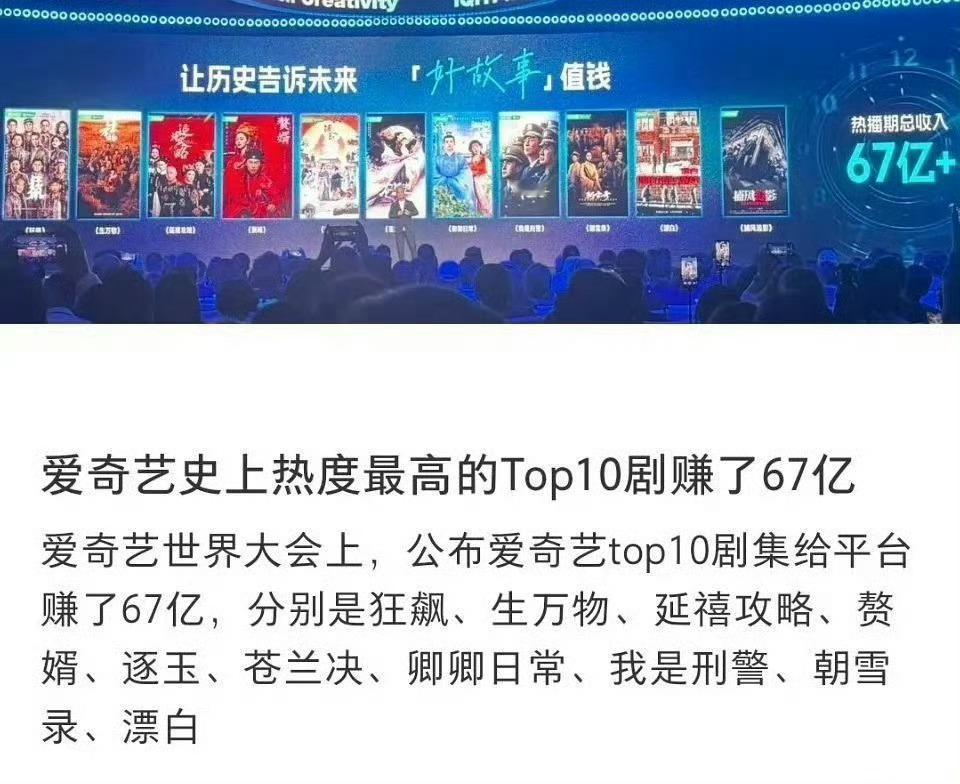 4月20日,爱奇艺AI艺人库被艺人集体否认授权,官方紧急澄清仅为合作意愿,至于爱奇艺宣称的十部剧赚了67亿,同样有水分,具体来看:《狂飙》22亿、《延禧攻略》13亿、《赘婿》10亿、《漂白》5.5亿,这4部合计50.5亿、占75%,剩下6部合计仅16.5亿,平均单部2.75亿,多数剧集收入覆盖不了制作成本。爱奇艺称AI艺人库仅是合作意愿爱奇艺顶级IP赚了118亿
