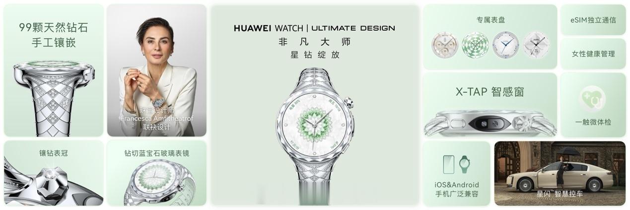 华为首款珠宝智能腕表HUAWEI WATCH非凡大师 星钻绽放重磅发布,携手国际珠宝设计师打造,手工镶嵌99颗天然钻石,首发多囊卵巢风险评估等专业健康功能,兼顾奢华质感与专业健康管理;WATCH FIT 5系列首发“微运动”功能,精准适配久坐人群,国补后到手价935元起;手表耳机二合一的WATCH Buds 2完成减重与降噪升级,售价3488元起。