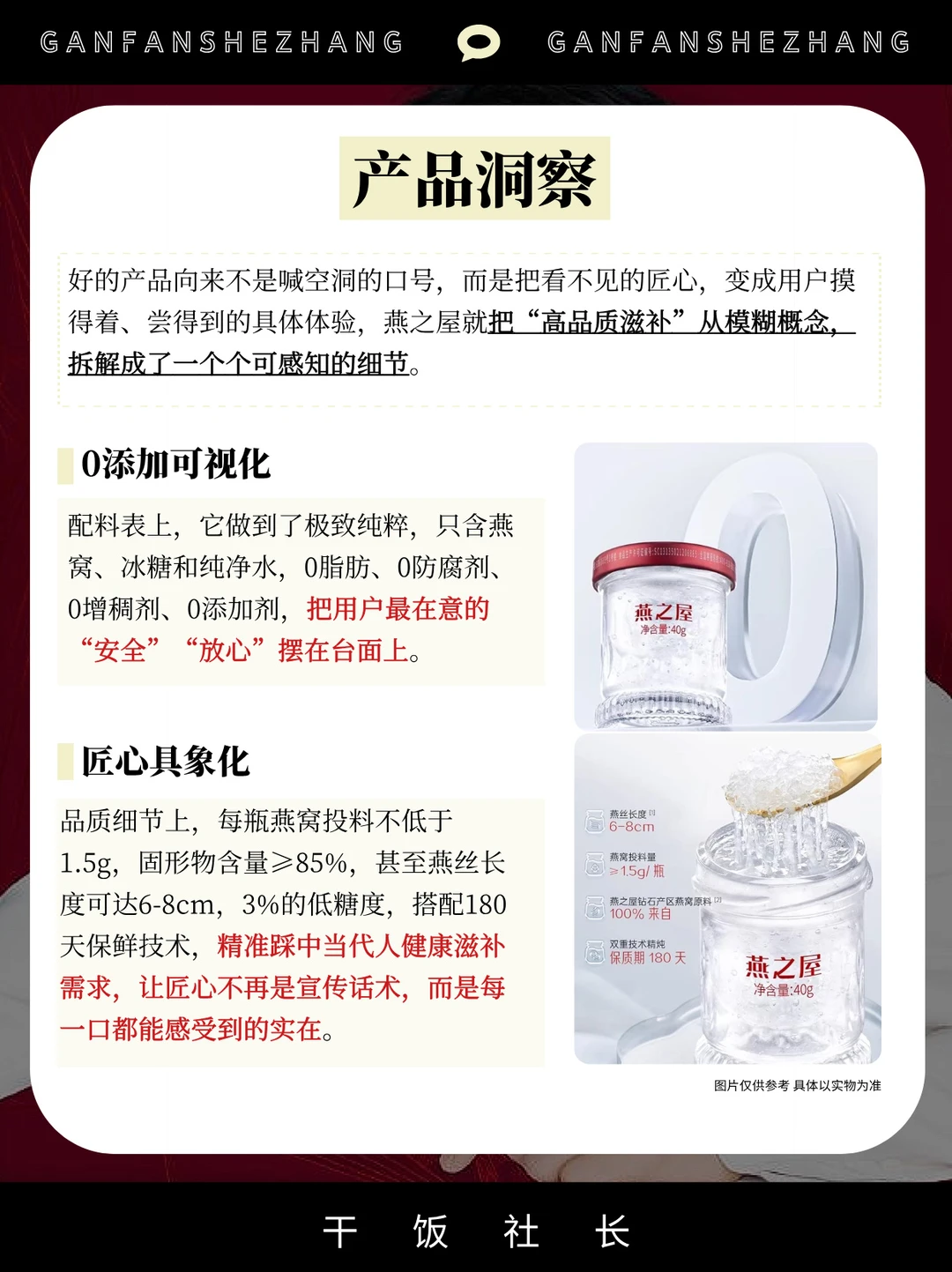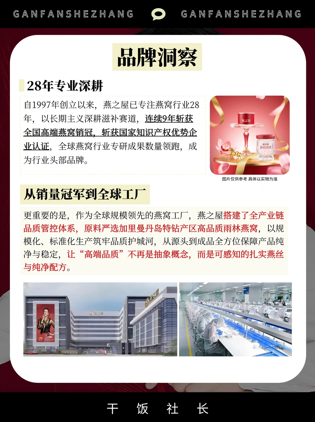 ✅其次,依托其全球燕窝工厂的供应链实力与“0添加”的纯净配方,夯实高端品质护城河;