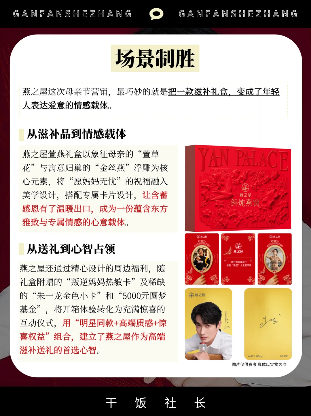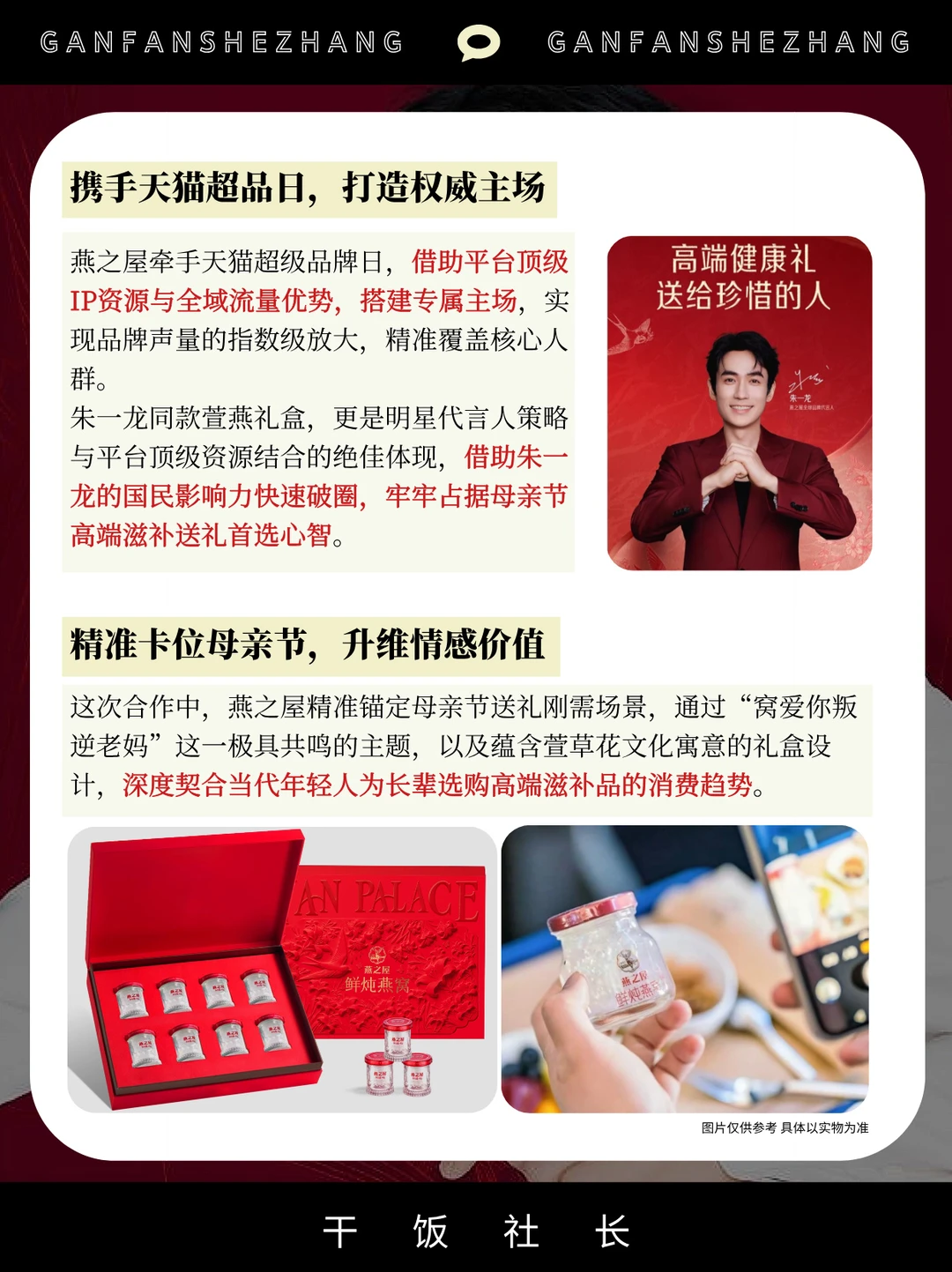 在这个快速增长的赛道中,作为稳居头部的标杆玩家-燕之屋,最近,联合天猫超级品牌日发起的母亲节营销,不仅推出了朱一龙同款萱燕礼盒,更是对“如何打动当代消费者”的一次系统化回答。
