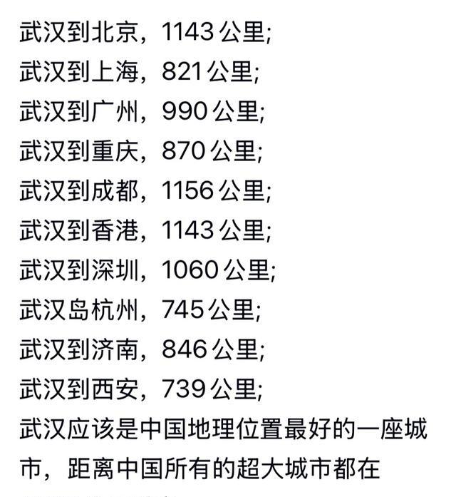 中央将武汉市定位为中部的中心城市,确实很有道理的,地理位置太优越了,九省通衢的交通优势,长江的水运,南北,东西便利的铁路运输,特别是从武汉出发到上海,北京,广州,西安等东西南北大城市一千公里左右的距离,使得武汉的便利更突出。
