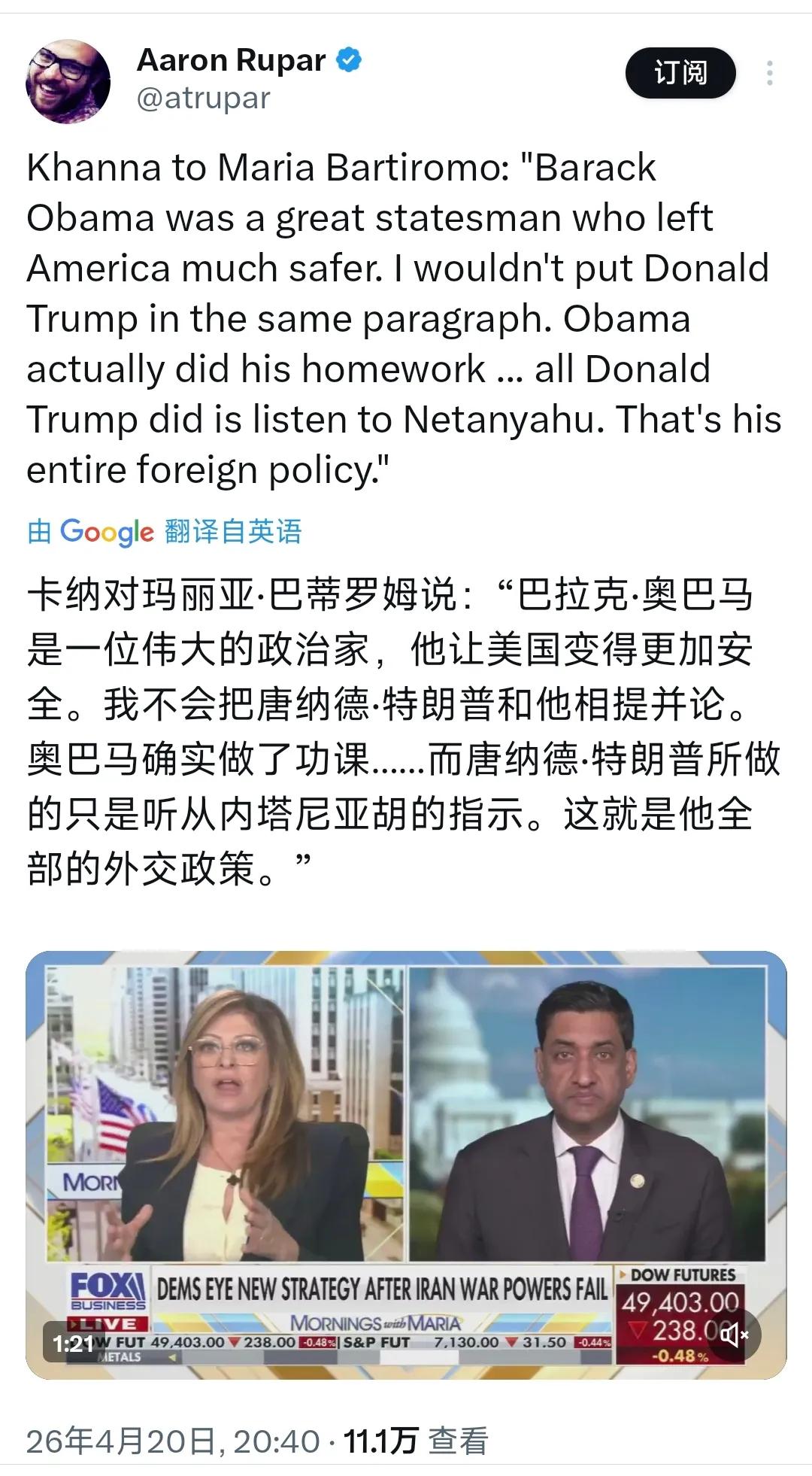 4月20日,在连线采访中,美国民主党籍众议员罗·康纳对福克斯新闻主持人玛丽亚·巴蒂罗莫说:“巴拉克·奥巴马是一位伟大的政治家,他让美国变得更加安全。我不会把唐纳德·特朗普和他相提并论。奥巴马确实做了功课......而唐纳德·特朗普所做的只是听从内塔尼亚胡的指示。这就是他全部的外交政策。”