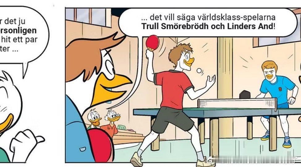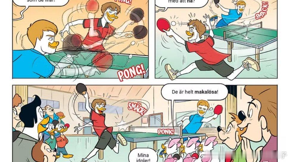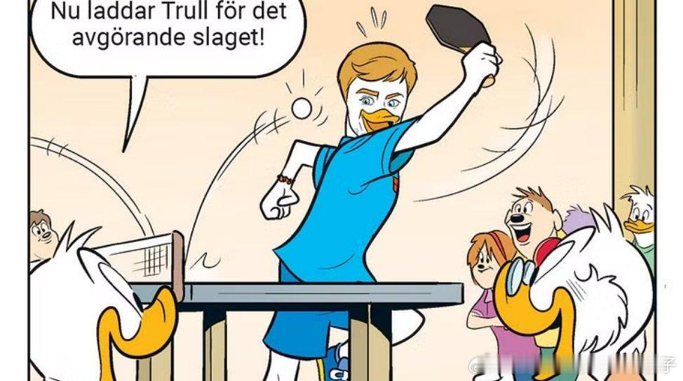 【瑞典媒体】当特鲁斯·莫雷高德造访鸭堡时遭遇乒乓球乱局他曾在最宏大的赛场和赛事中迎战世界顶尖高手。如今,等待乒乓球明星特鲁斯·莫雷高德的是一项截然不同的挑战——整顿鸭堡的乒乓球乱局。在最新一期《唐老鸭和他的伙伴们》(2026年第17期)的系列漫画《弹跳乒乓》中,我们见到了前所未见的特鲁斯——他长着鸭嘴,化名"特鲁尔·斯莫雷布罗德"。与他一同现身鸭堡的还有丹麦顶尖选手安德斯·林德,在漫画中他化身为"林德斯·安"。当唐老鸭试图用特鲁尔和林德斯作为招牌,让史高治·麦克老鸭的乒乓球馆热闹起来时,球馆迅速挤满了热爱运动的鸭堡市民——但很快,意想不到的麻烦也接踵而至。日益失控的乒乓乱局考验着选手们的技术,当两位乒乓球明星被迫出手救场时,他们既需要高超的球技,也需要过人的冷静。"能加入《唐老鸭和他的伙伴们》让我感到既荣幸又非常开心。我从小就看这本漫画,现在自己能成为这个世界的一部分,感觉有点不真实。"特鲁斯·莫雷高德说。特鲁斯的鸭堡首秀,恰逢乒乓球运动即将迎来历史性的周年纪念。4月28日至5月10日,乒乓球团体世锦赛将在伦敦举行,距离首届世锦赛在同一城市举办正好过去了100年。如今,这项赛事已发展为男女各64支球队参赛的规模,而瑞典男队正是夺冠热门之一。1926年也是乒乓球运动走向组织化的开端,国际乒联和瑞典乒协均在这一年成立——这标志着乒乓球在全球及瑞典国内走过了一个世纪,如今这一盛事将在鸭堡受到关注。"乒乓球非常适合我们的经典漫画刊物——它节奏快、激动人心且充满变数。能让特鲁斯出现在《唐老鸭和他的伙伴们》中真是非常有趣。他就像唐老鸭一样是一位深受喜爱的超级明星,但幸运的是,他远没有那么倒霉,而且更擅长控制自己的情绪。" 《唐老鸭和他的伙伴们》编辑项目负责人安娜·贝里斯特伦表示。本期还刊登了一篇独家专访,特鲁斯在访谈中谈到了他的中文名字、巡回赛生涯的点点滴滴,以及他身边的哪些人最像鸭堡中最著名的那些角色。《弹跳乒乓》由亚科·塞佩莱编剧,米格尔·费尔南德斯绘画,刊登于2026年4月22日上架的《唐老鸭和他的伙伴们》第17期。
