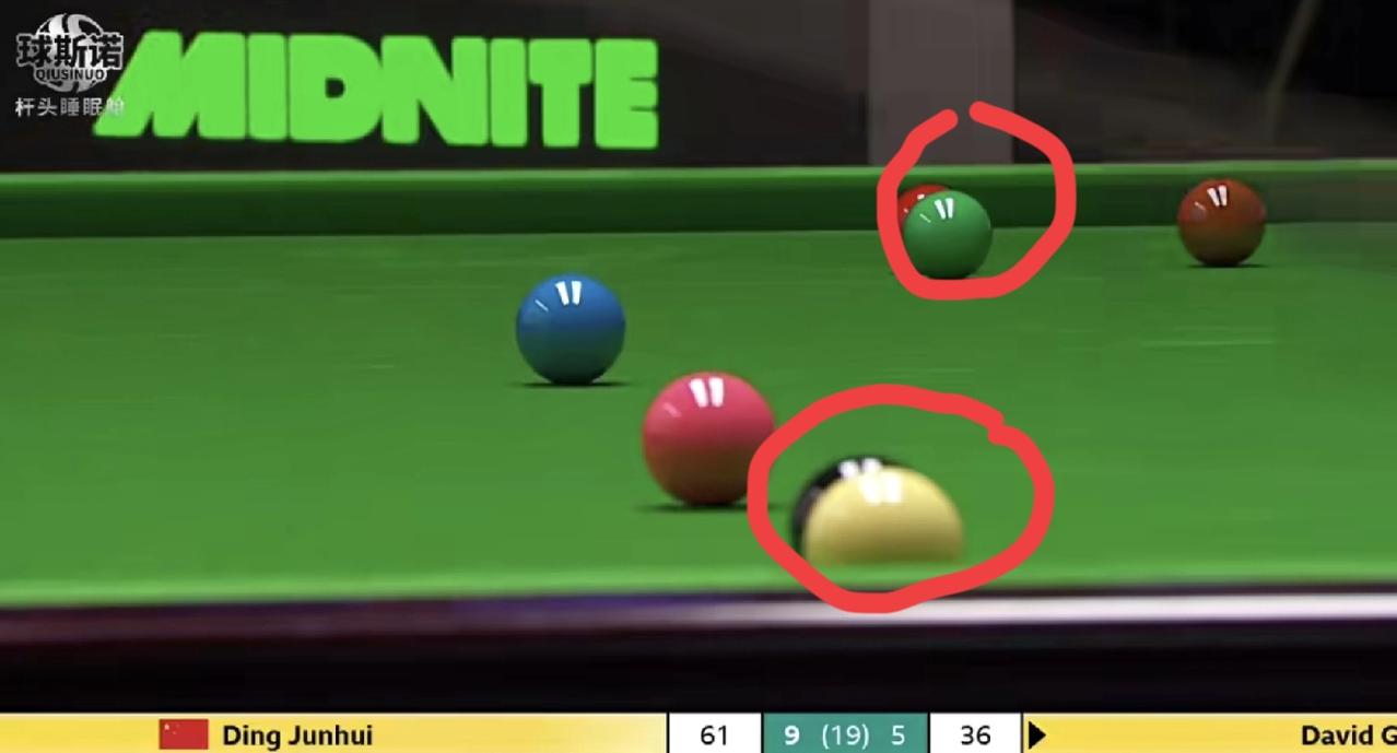 此刻,丁俊晖61-36,然后做了一杆无可挑剔的斯诺克:母球藏在黑球后面,最后一颗目标红球藏在了选台对面的绿球后。吉尔伯特不但没解到,还形成了自由球。