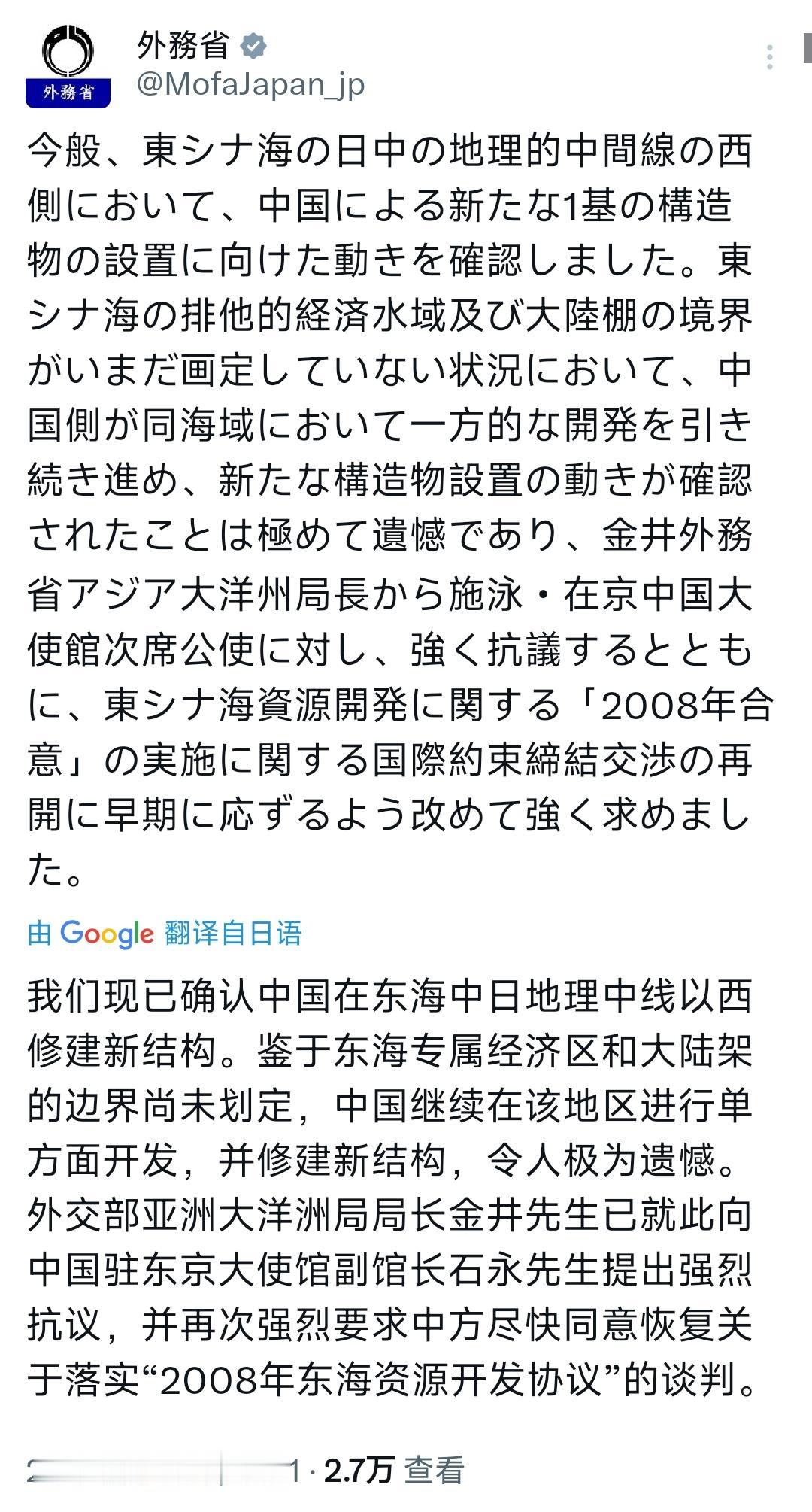 日本外务省官方账号今天(4月20日)发文写道:“近日,我们确认了中国在东海中日地