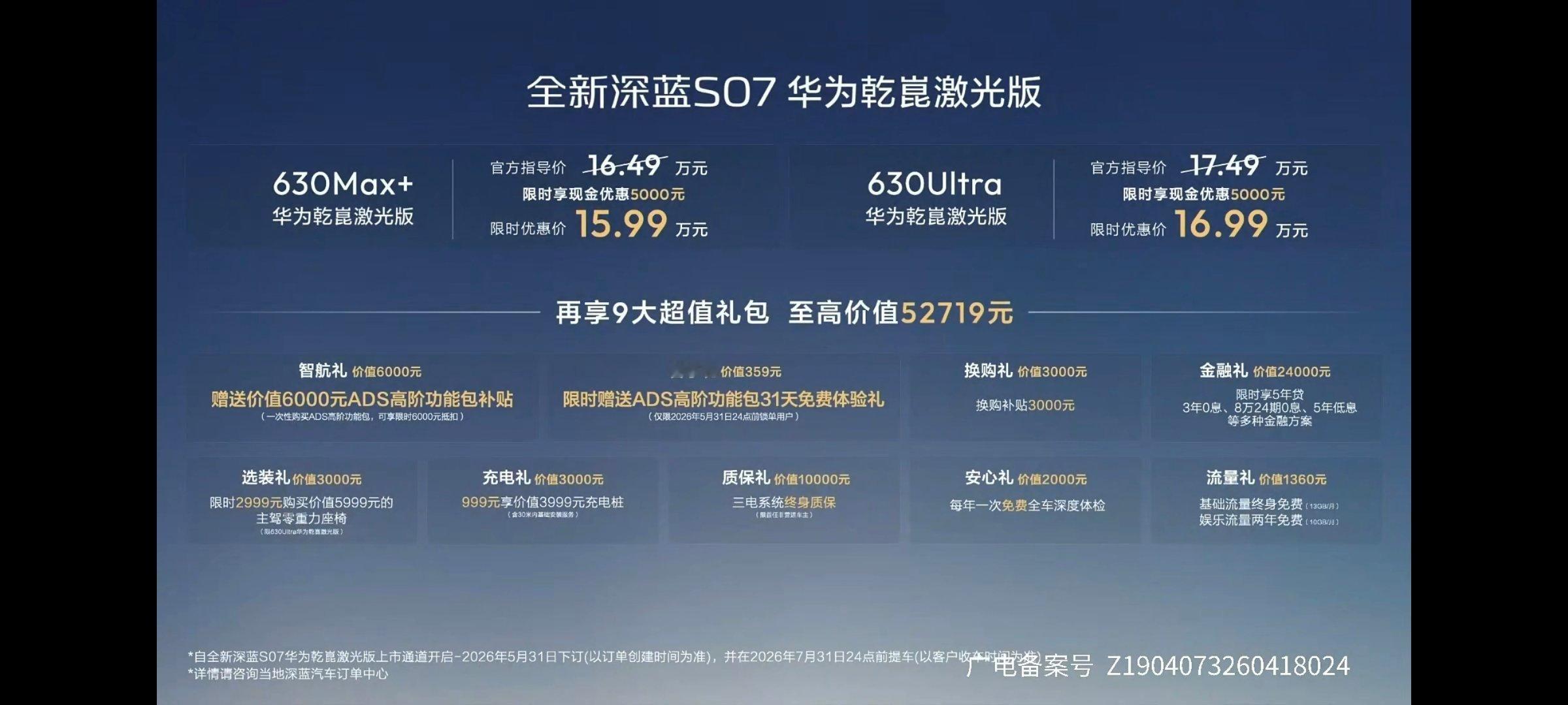 新深蓝S07的价格来啦,加上首销优惠630Max+华为乾崑激光版 15.99万元630Ultra华为乾崑激光版 16.99万元这个价格的高阶智驾SUV,很香啊,大家喜欢吗? 华为乾崑激光上车深蓝S07 安全背后有乾崑 买车就买乾崑智驾