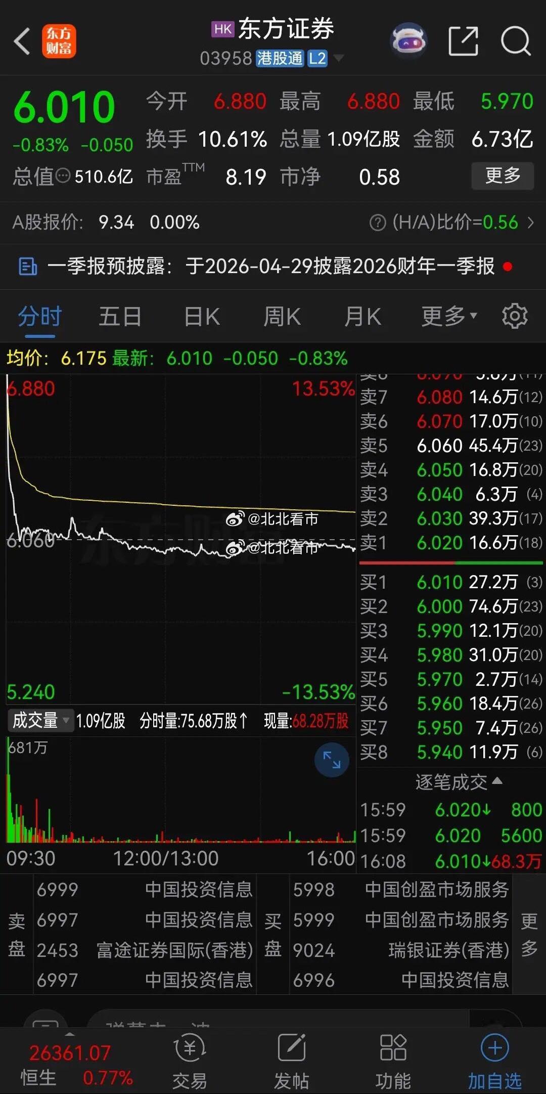 东方证券拟收购上海证券,进行并购重组大整合。A股今天停牌,而港股东方证券今天是正常开盘的,今天大幅高开13.53%,但开盘价就是全天最高价,开盘后瞬间闪崩,直线下跌,收盘的时候居然绿盘报收,下跌了0.83%,相当于从高点下跌超过14%,而今天进场的股民几乎全被套牢。