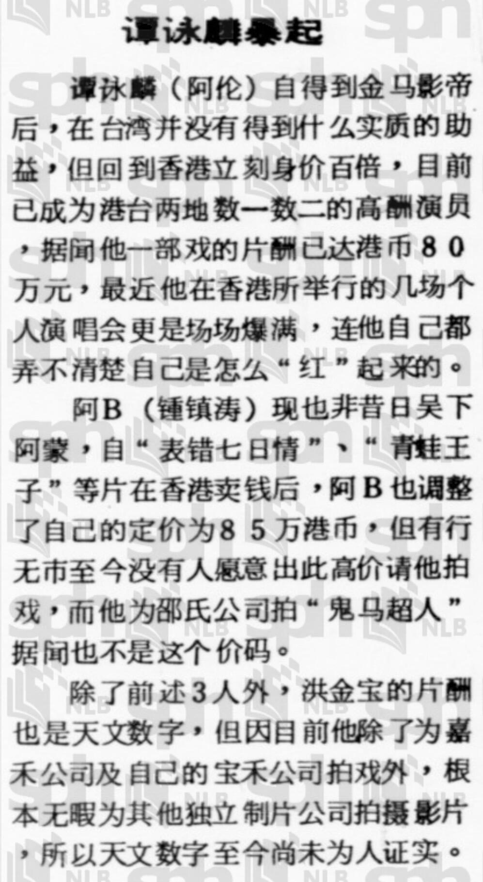1985年港台明星片酬