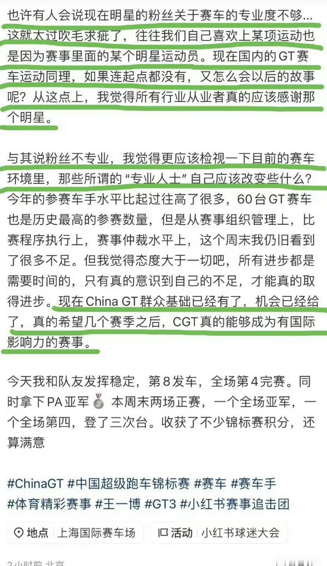 王一博,真的征服赛车圈了。他好🐮啊。又又又一个赛车手张臻东(飞驰人生林臻东原型)发文感谢王一博:是王一博把流量带到了赛车圈,把今年China GT的热度和水平提升到了全新的维度。娱乐圈 户外圈 赛车圈都证明了一句话:王一博在哪儿热度就在哪儿,王一博做什么都成功。真正热爱赛车的人,一定会尊重 感谢 王一博。王一博对赛车的推动作用,除了王一博,没有谁能做到了。
