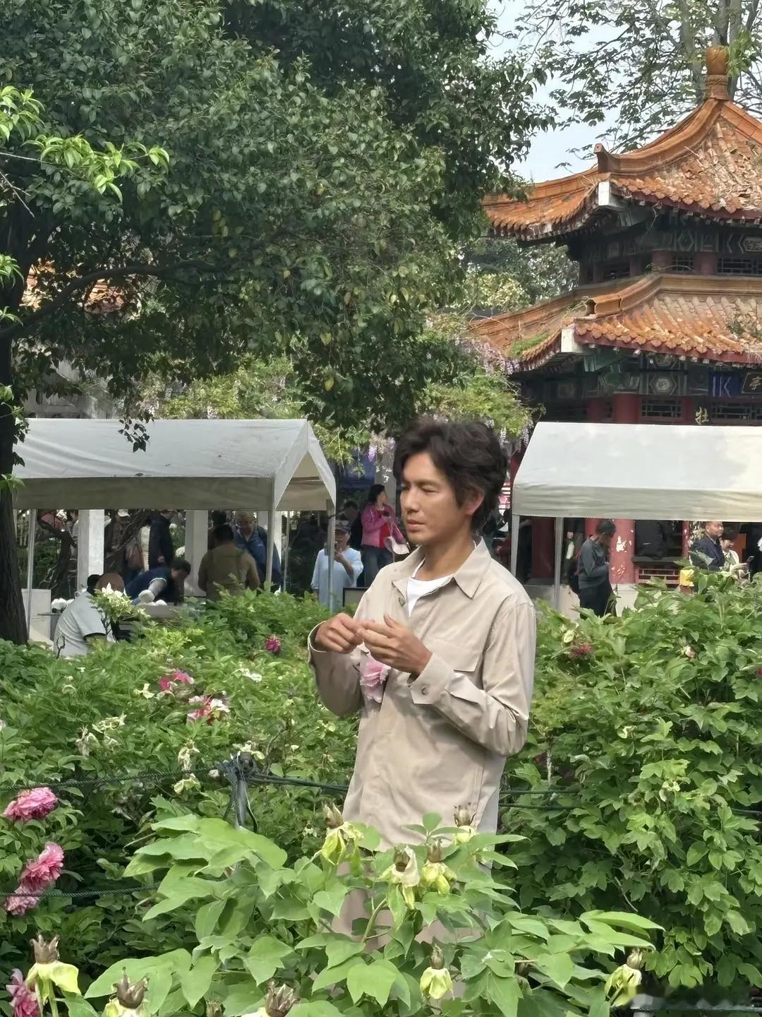 钟汉良现身洛阳牡丹园,这状态太好了!他一身浅卡其色休闲套装,墨