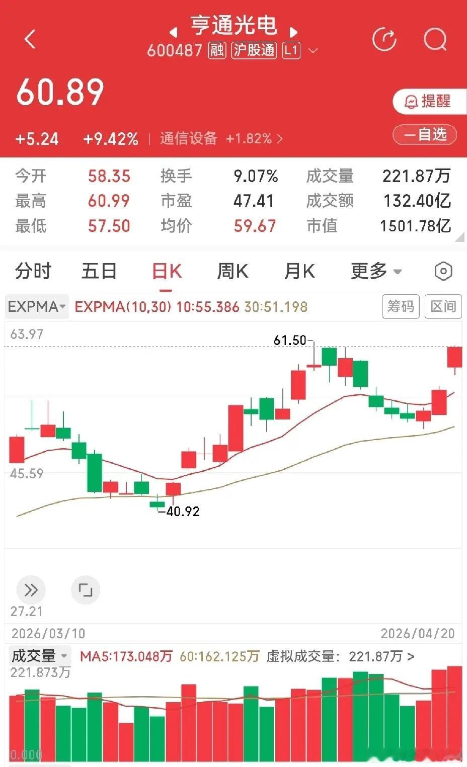 常常有人说出利好就是为了出货,这种说法也要看在什么时候,什么位置,什么样的市场环境,什么具体利好消息。周末的国产光纤全球爆单的消息,应该属于实实在在对业绩有推升作用的利好,这种利好与主力拉升后配合出货的利好,有一些区别。今天,光电股份,亨通光电,驰宏锌锗,走得不错,也是一个验证。永鼎股份涨得少一点,是因为前面涨得太多了。光电股份,这个24.44是不是所谓的对数顶,还得观察。亨通光电,又创收盘新高了。驰宏锌锗的位置,相对而言似乎不高,不过其走势好像也不太引人注目。