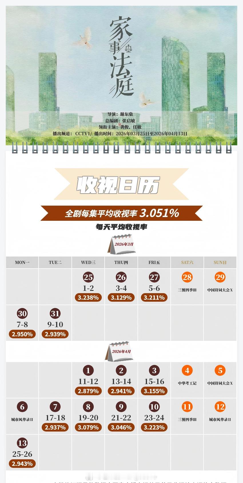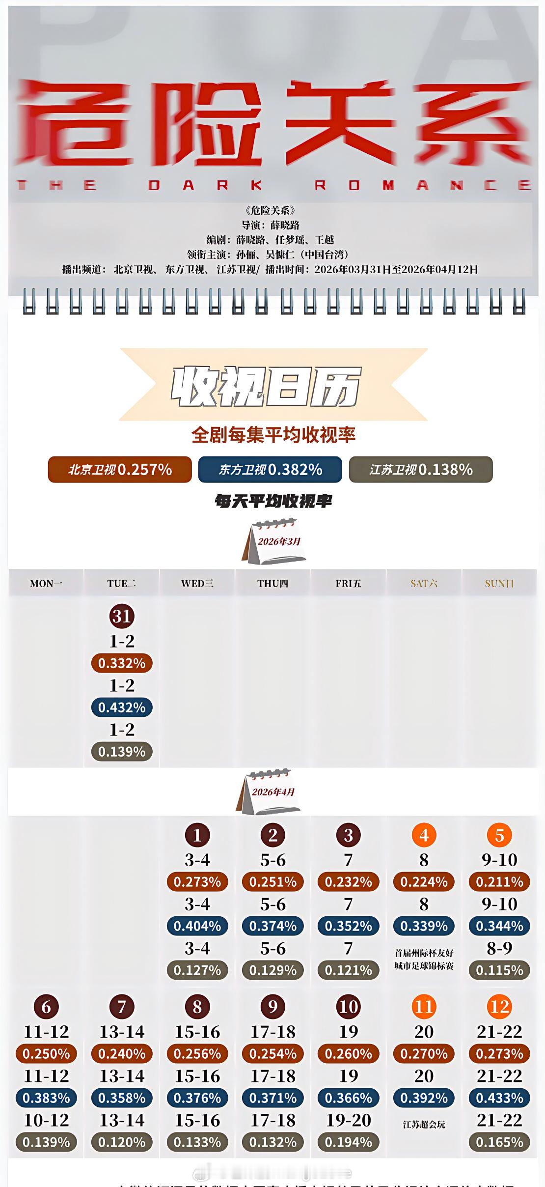 中国视听大数据CVB收视日历龚俊 / 任敏 家事法庭 平均收视率3.051%,最高单日3.238%(央一完结剧年亚) 孙俪 / 吴慷仁 危险关系 平均收视率东方0.382%/浙江0.257%/江苏0.138%,最高单日东方0.433%/浙江0.332%/江苏0.194%(完结剧东方卫视年度第四/浙江卫视年度第四/江苏卫视年季) 魏哲鸣 / 郑合惠子 家事法庭 平均收视率0.256%,最高单日0.325%(湖南卫视完结剧年度第四)