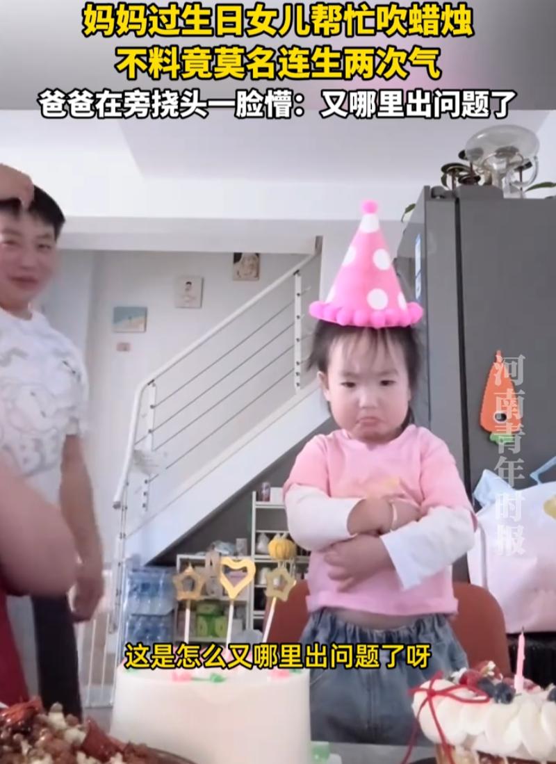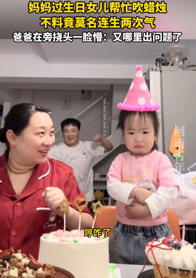 这翻脸比翻书都快!天津,一女孩过生日,父母做了一桌的饭菜,买了生日蛋糕吹蜡烛,本来女儿吹的时候还高高兴兴的,可下一秒就生气了,接连吹了两次,女儿莫名其妙生了两次气,爸爸直接懵了:这到底是哪出了问题?