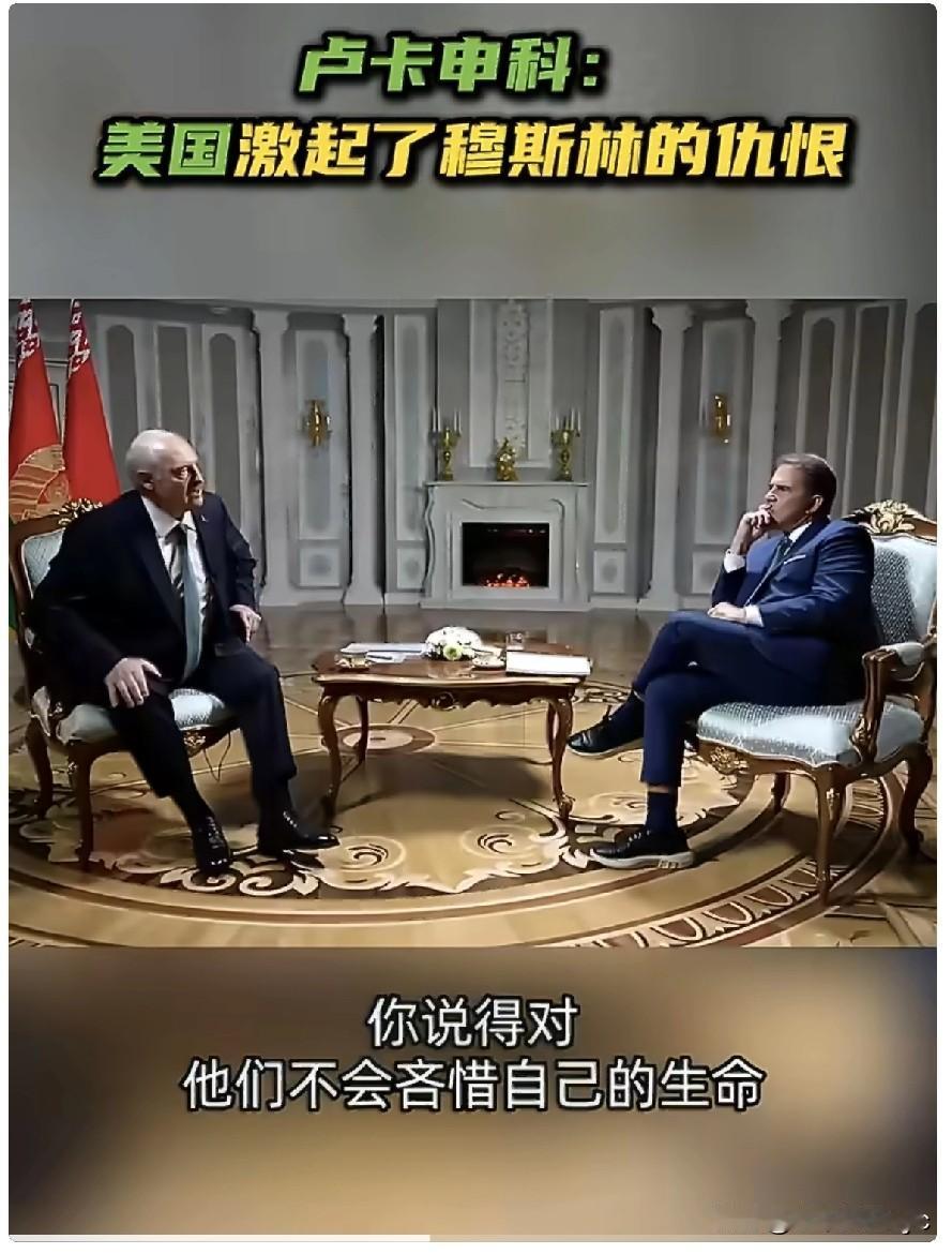 4月20日,白俄罗斯总统卢卡申科接受RT独家采访时表示。“你们(美国)激怒了整个穆斯林世界,而那里的人民是坚强的。你说得对,他们不会吝惜自己的生命,为了保护自己的价值观,他们绝不会吝惜生命。”