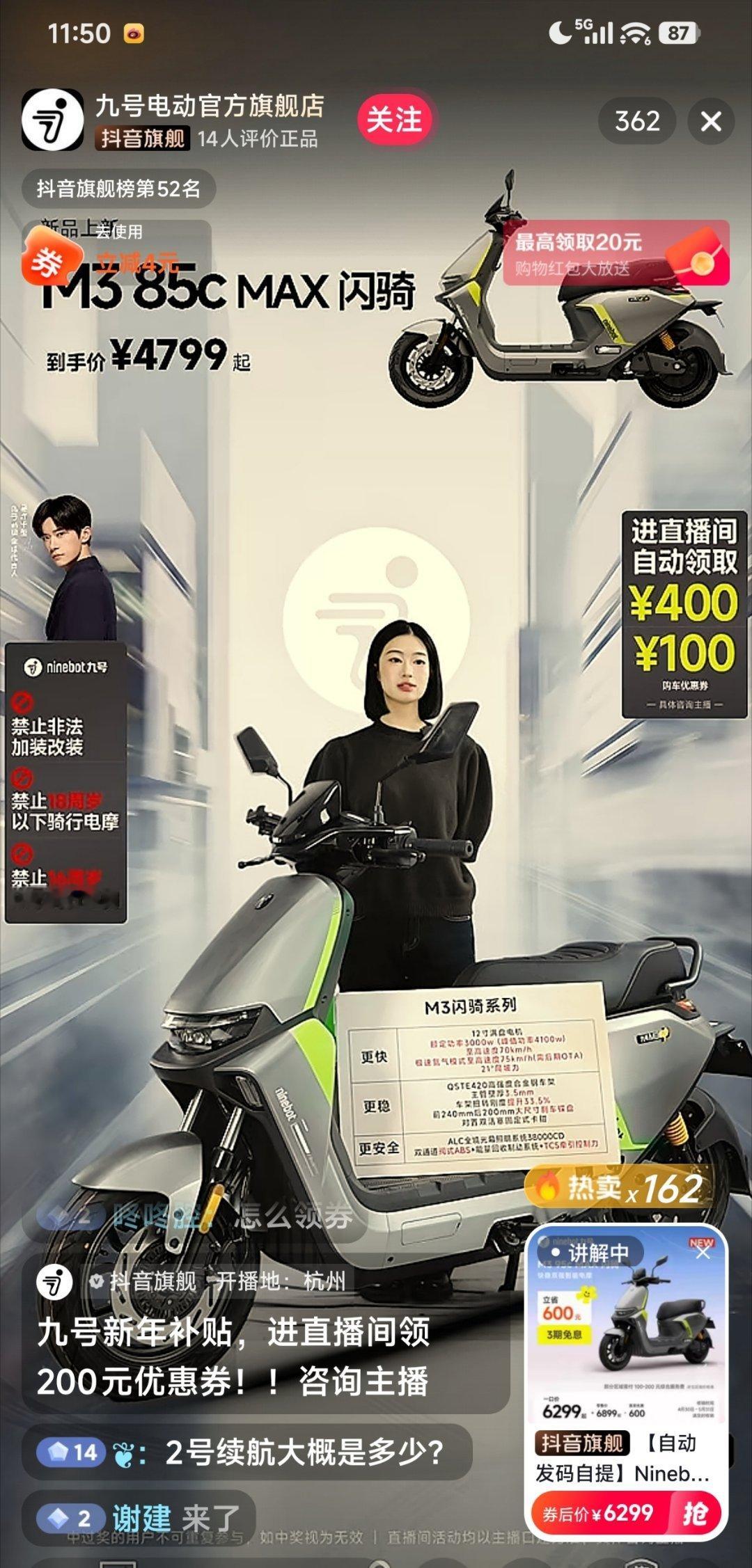 这个时间段,抖旗舰店直播间在线人数一览:九号电动车(代言人易烊千玺)362人。安