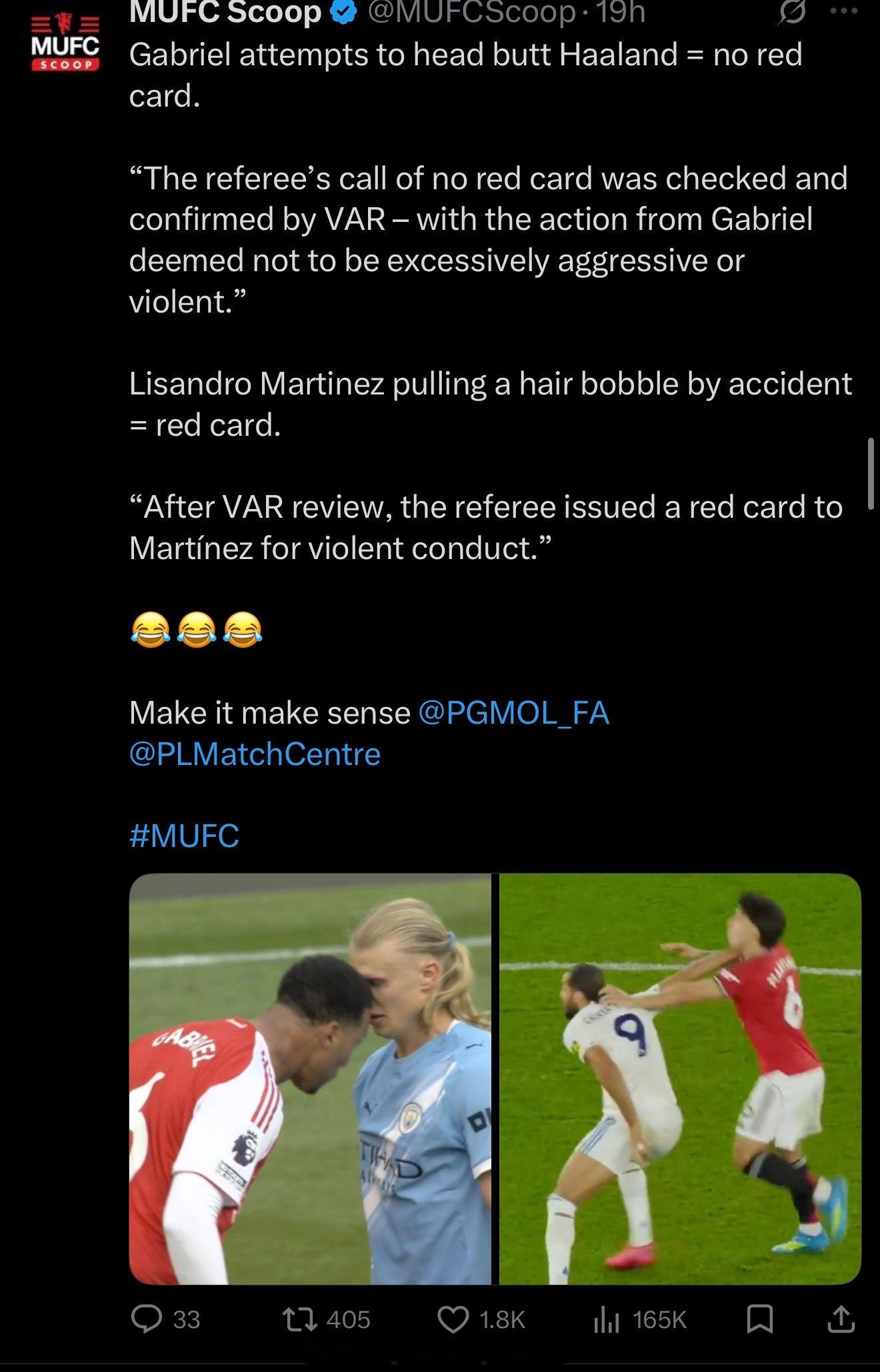 英超裁判的双标:故意顶牛没有红牌,非故意抓到小辫子红牌球迷:利马将因为加布里埃尔对哈兰德的顶牛犯规加罚一场