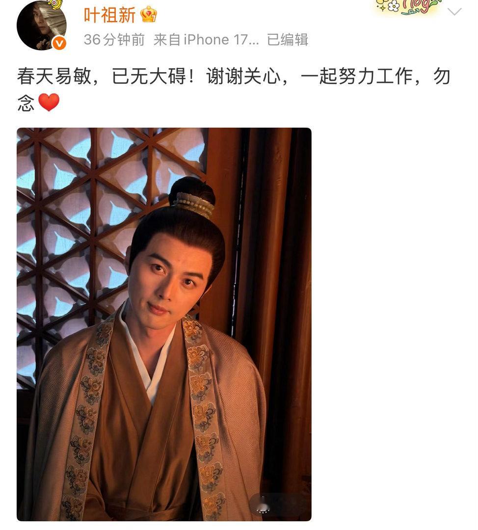 叶祖新剧组出妆路透脸部过敏,涂满了白色药膏。叶祖新发博回应:春天易敏,已无大碍。