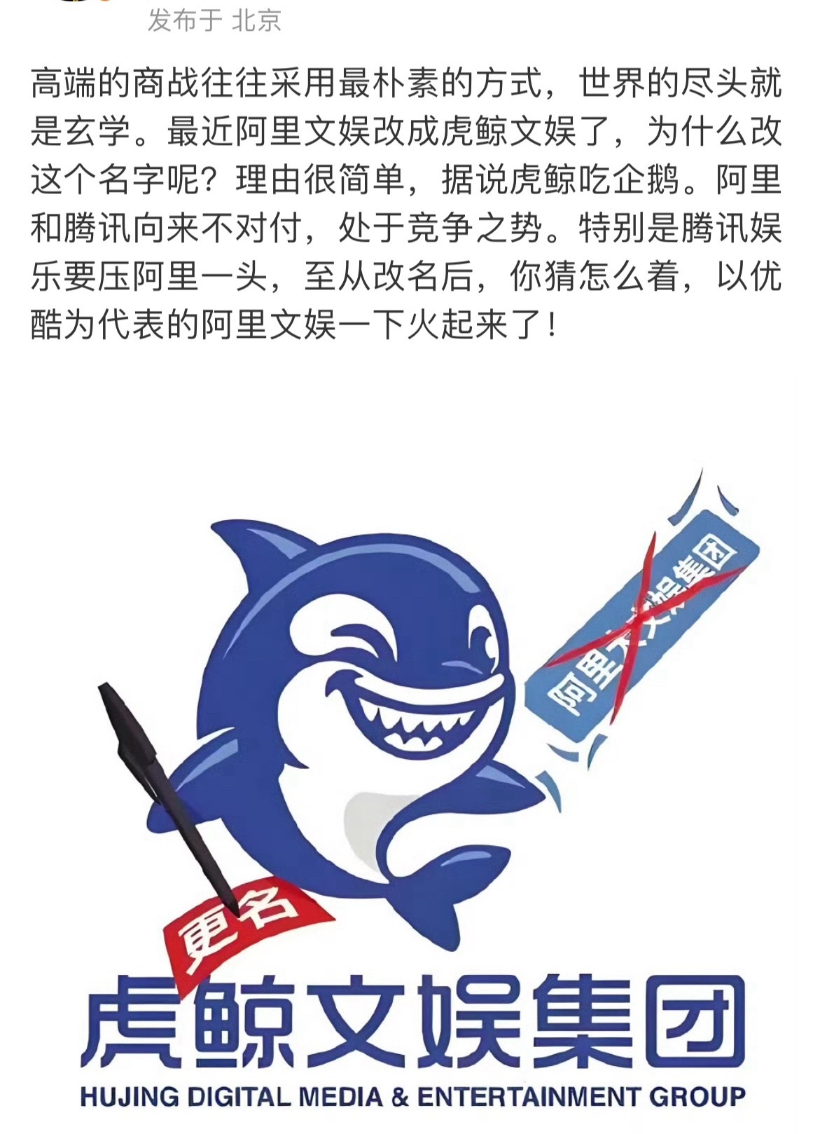 平台的商战是朴实无华的,据说为了压腾讯,阿里文娱把优酷改名叫虎鲸,因为鲸鱼吃企鹅