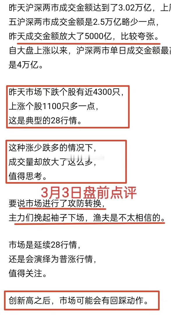 金姐在3月3日开盘前提示两点:大盘会创新高,但新高后谨防下跌(图)。原因是3月2日成交量异常放大(增加5000亿)。