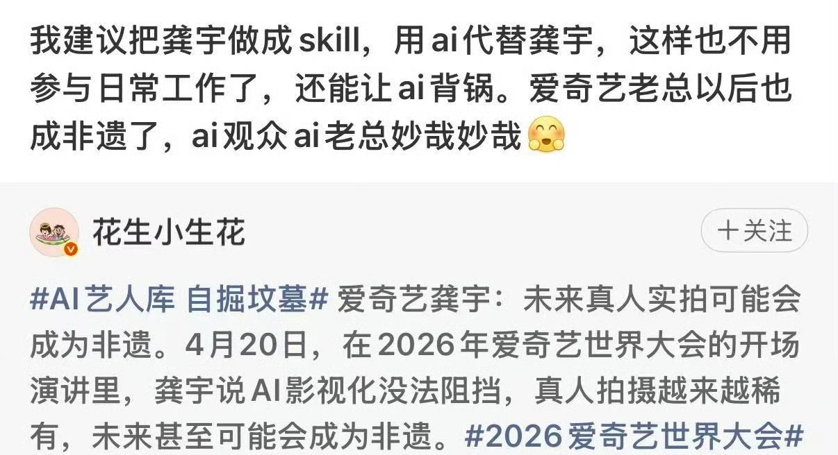 如果艺人都能AI化,那龚宇skill、AI观众都能实现,真人非遗的想法太离谱,爱奇艺穷疯了也得有底线。若爱奇艺用AI全面替代真人,爱奇艺长剧将实现规模化量产,不谈大量演员的失业,没有“活人感”的影视作品,还能吸引多少受众?龚宇说的很直白,传统实拍成本高、周期长、效率低,AI能把内容产出量提升100倍以上。成立16年的爱奇艺,将完成从播放平台转向AI内容社区的最大转型,长剧靠AI降本,短剧、漫剧靠AI量产。