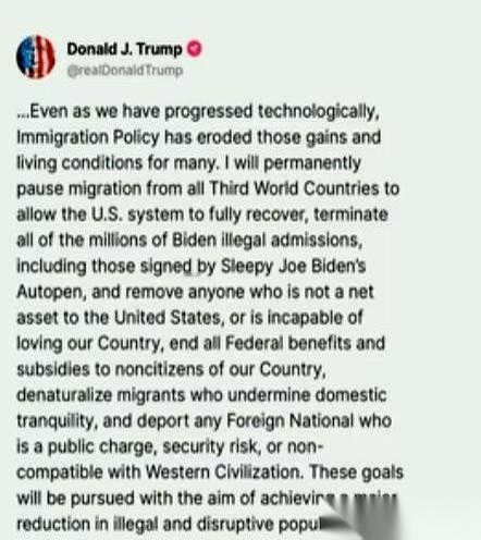 他一连砸下三道铁令:第三世界国家的人别想再进来,拜登时期进来的非法入境者通通赶走,所有非美国公民的联邦福利,一分钱都不再发。