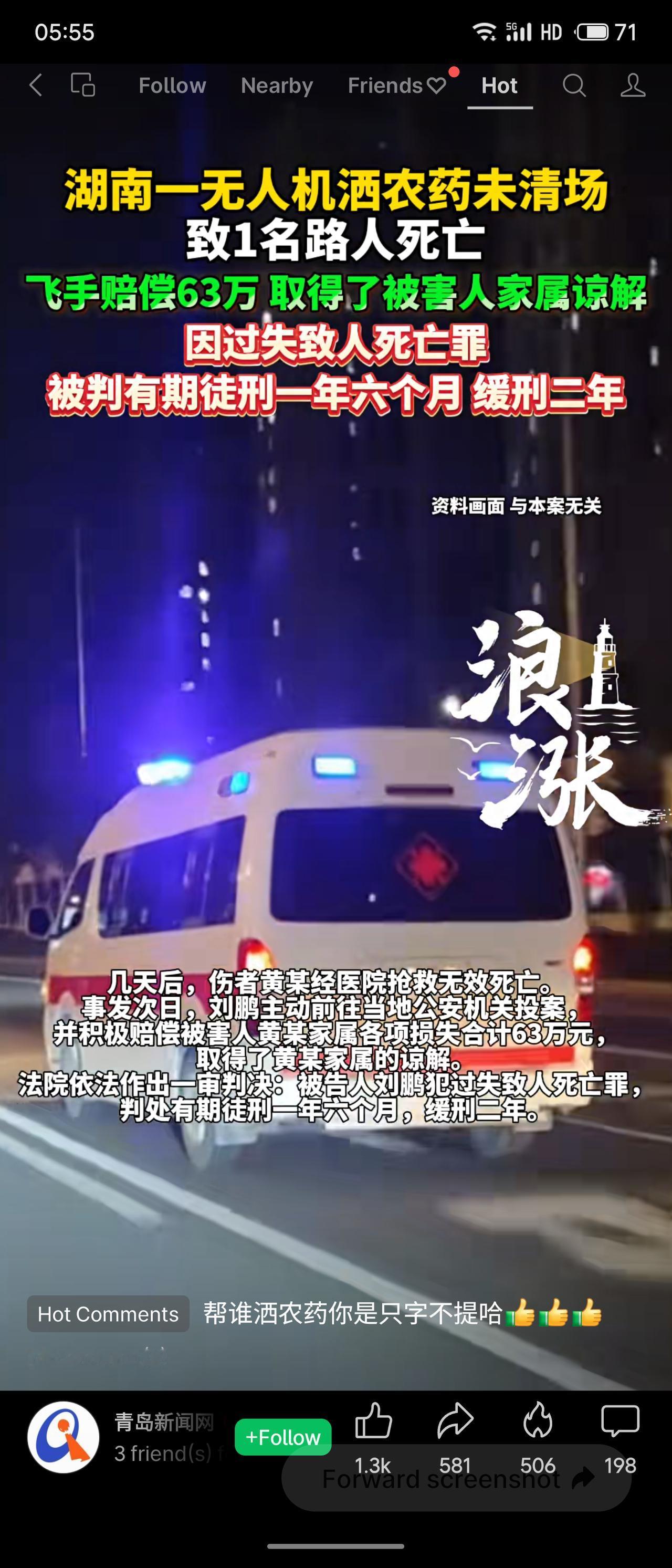 这起悲剧暴露出农用无人机作业中安全规范的严重缺失——降落前未清场、未观察,直接导致路人死亡。飞手虽具备资质,但操作麻痹大意,过于自信。主动投案与积极赔偿体现了责任担当,法院缓刑判决合法合理。此案警示:无人机作业必须严格执行清场与警示流程,行业亟需强化安全监管与现场管理,防止类似“空中杀手”事件重演。