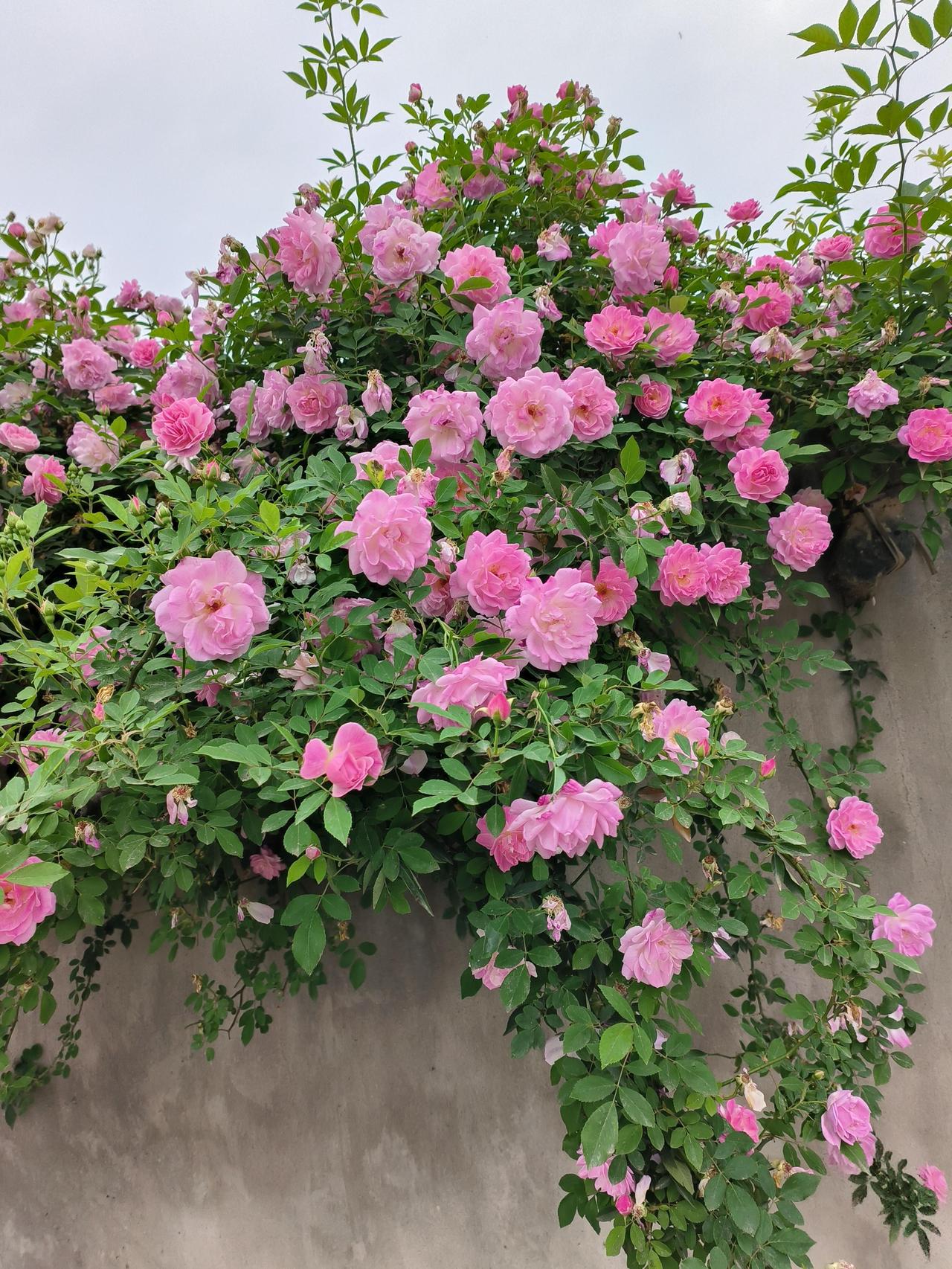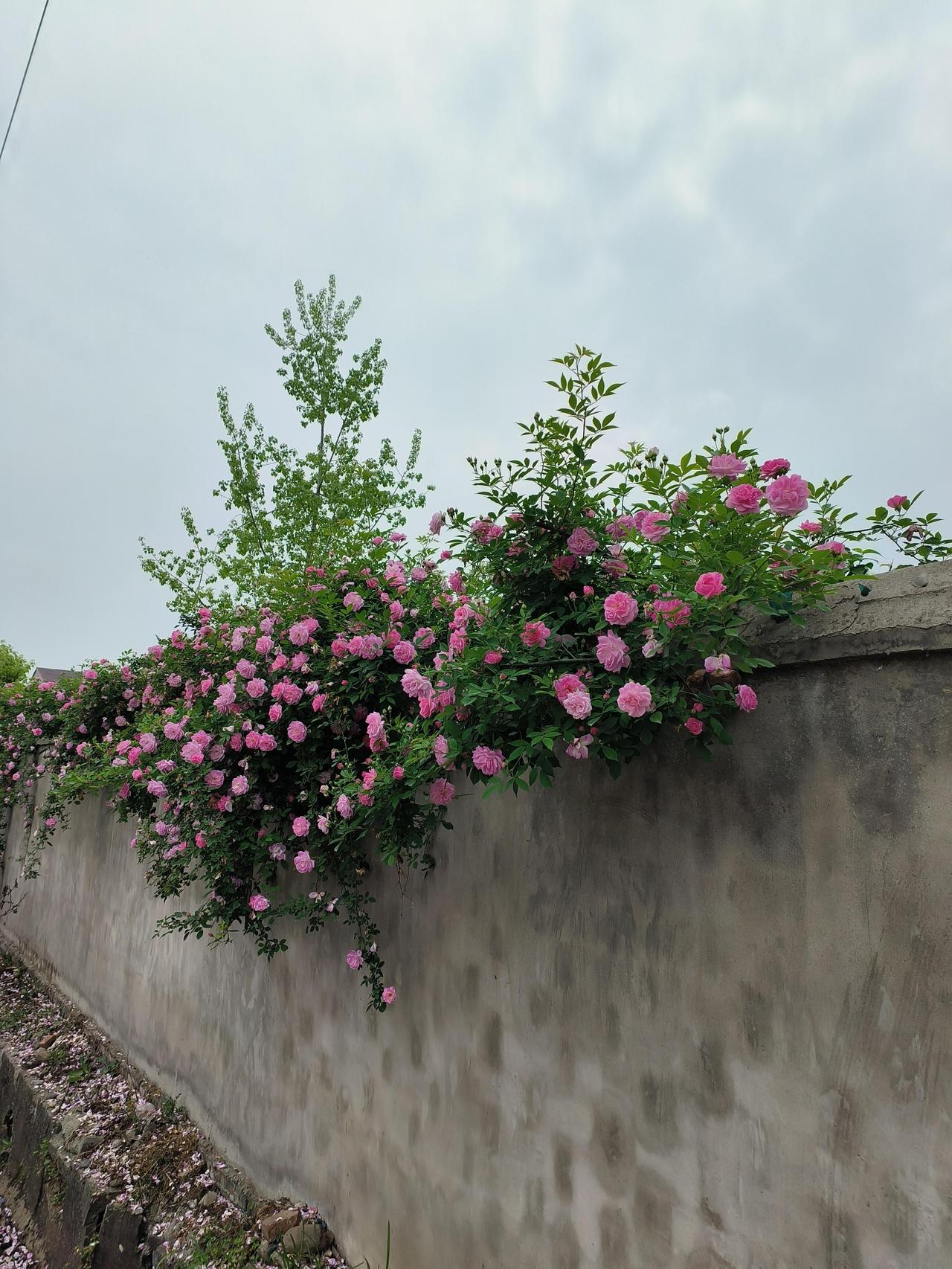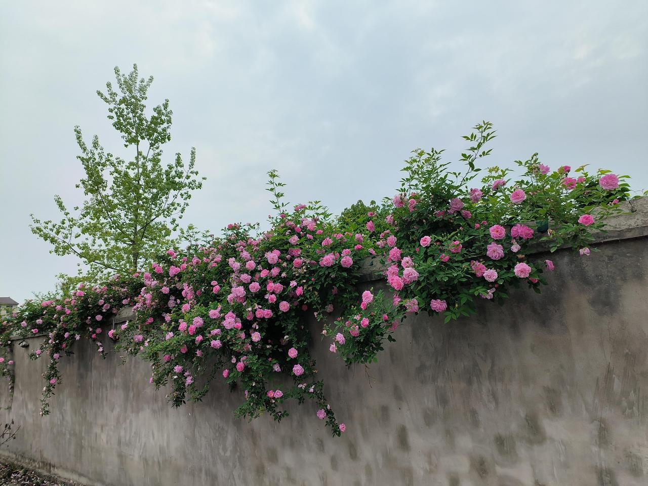 那这一墙蔷薇,真是开到了极致。 远远望去,像绯红的瀑布从墙头倾泻而下,成千上万