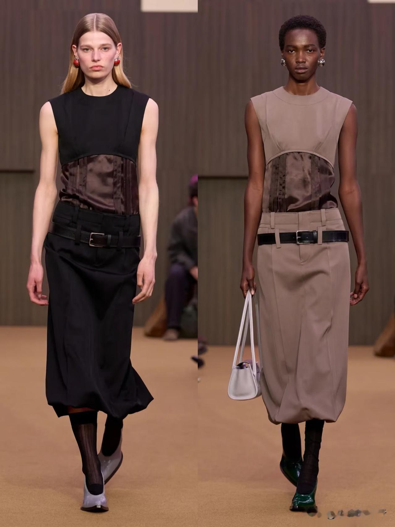 本季整体风格极具辨识度,以沉稳黑色作为主基调,搭配柔和粉彩色系点缀,平衡了酷感与温柔。设计上满是90年代复古印记,利落的尼龙连衣裙、宽松男式三粒扣西装外套,复刻经典廓形的同时,尽显随性腔调。