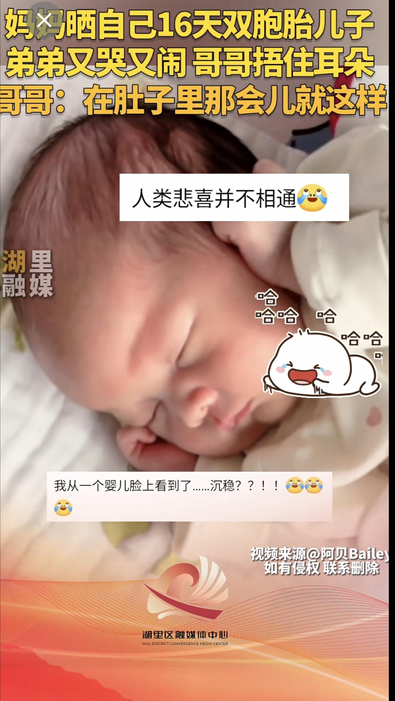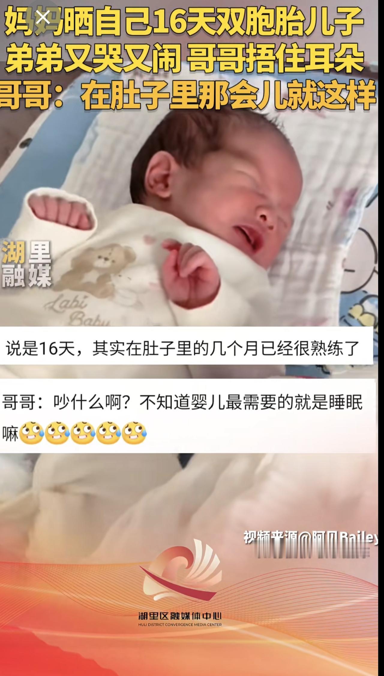 妈妈晒自己16天双胞胎儿子,弟弟又哭又闹,哥哥捂住耳朵。哥哥:在肚子里那会儿就这
