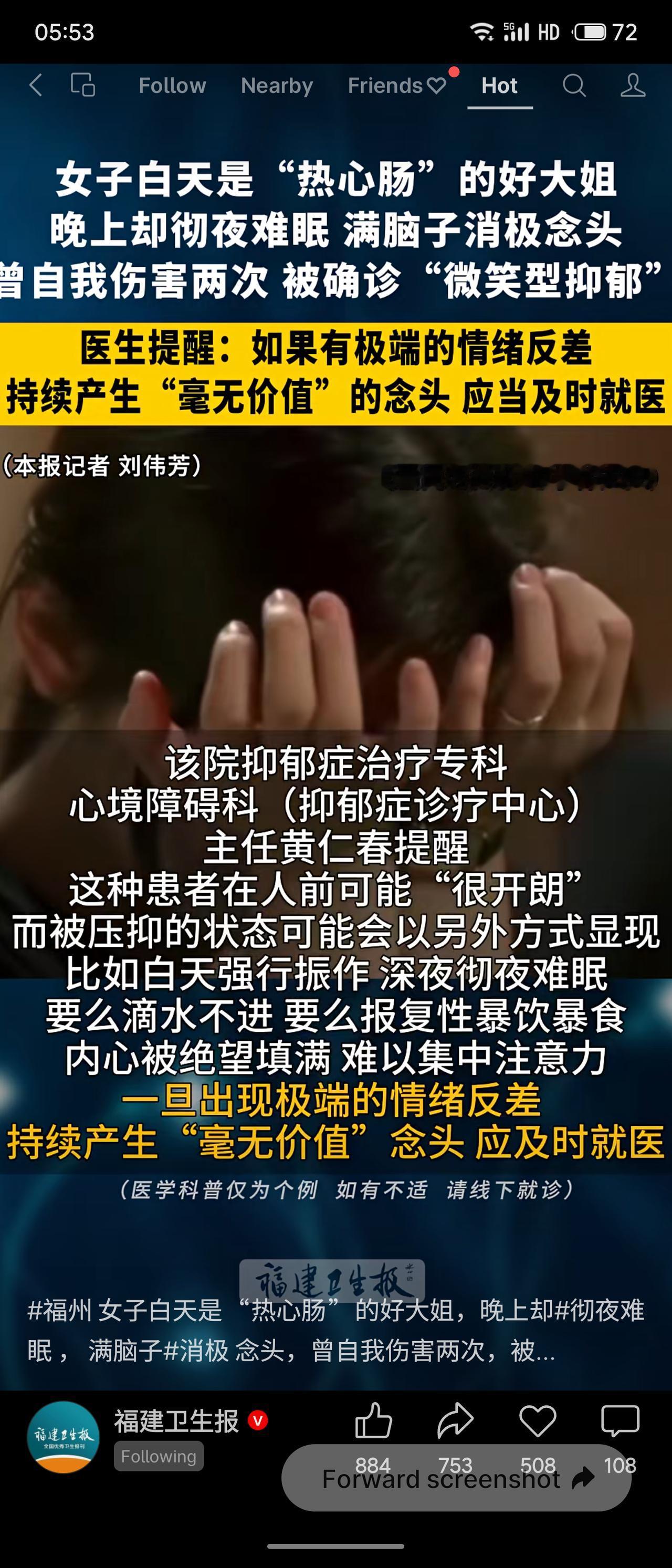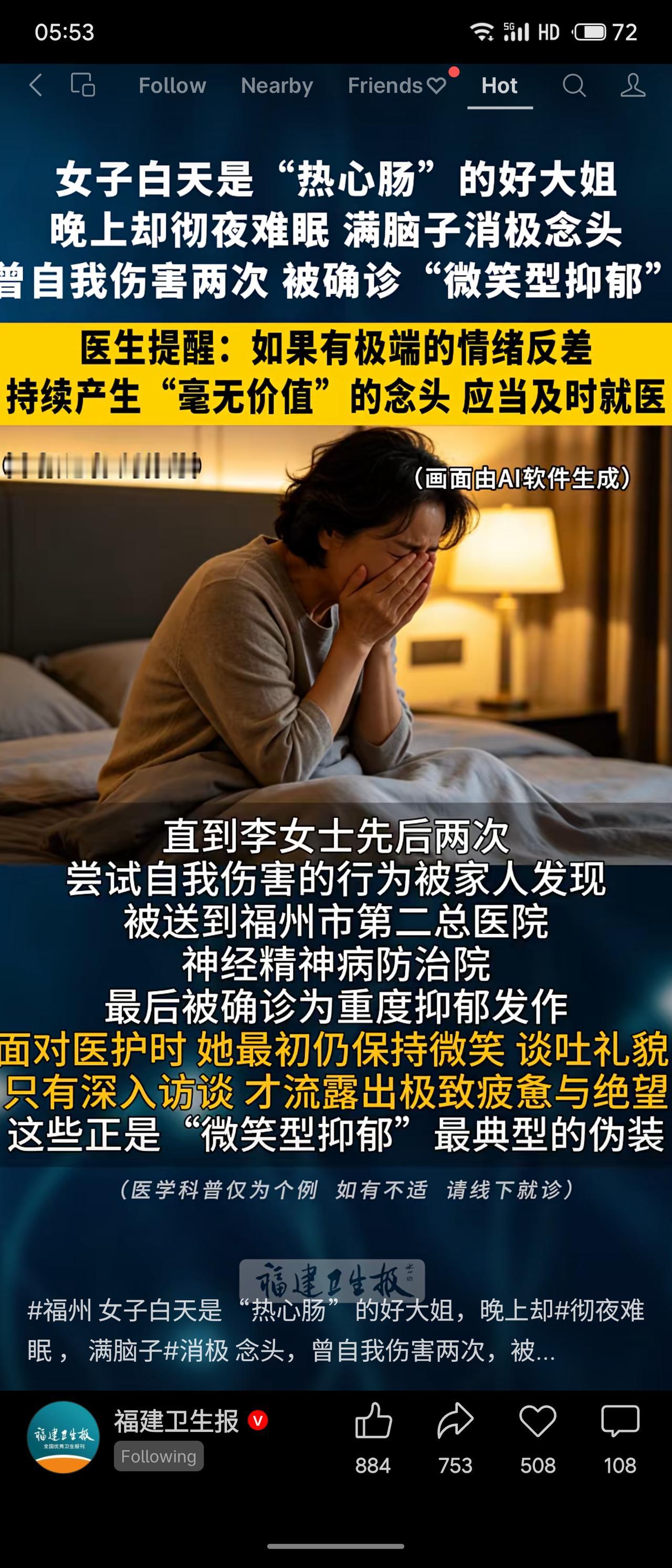 福州48岁李女士是邻里眼中的“热心肠”,谁家有难都伸手相助。但三年前开始心情低落、心悸手抖、夜不能寐,满脑子消极念头。白天她强颜欢笑出门,深夜却极度绝望,曾两次自伤,被家人发现后送医,确诊为重度“微笑型抑郁”。医生提醒:若出现极端情绪反差、持续感到“毫无价值”,应及时就医。