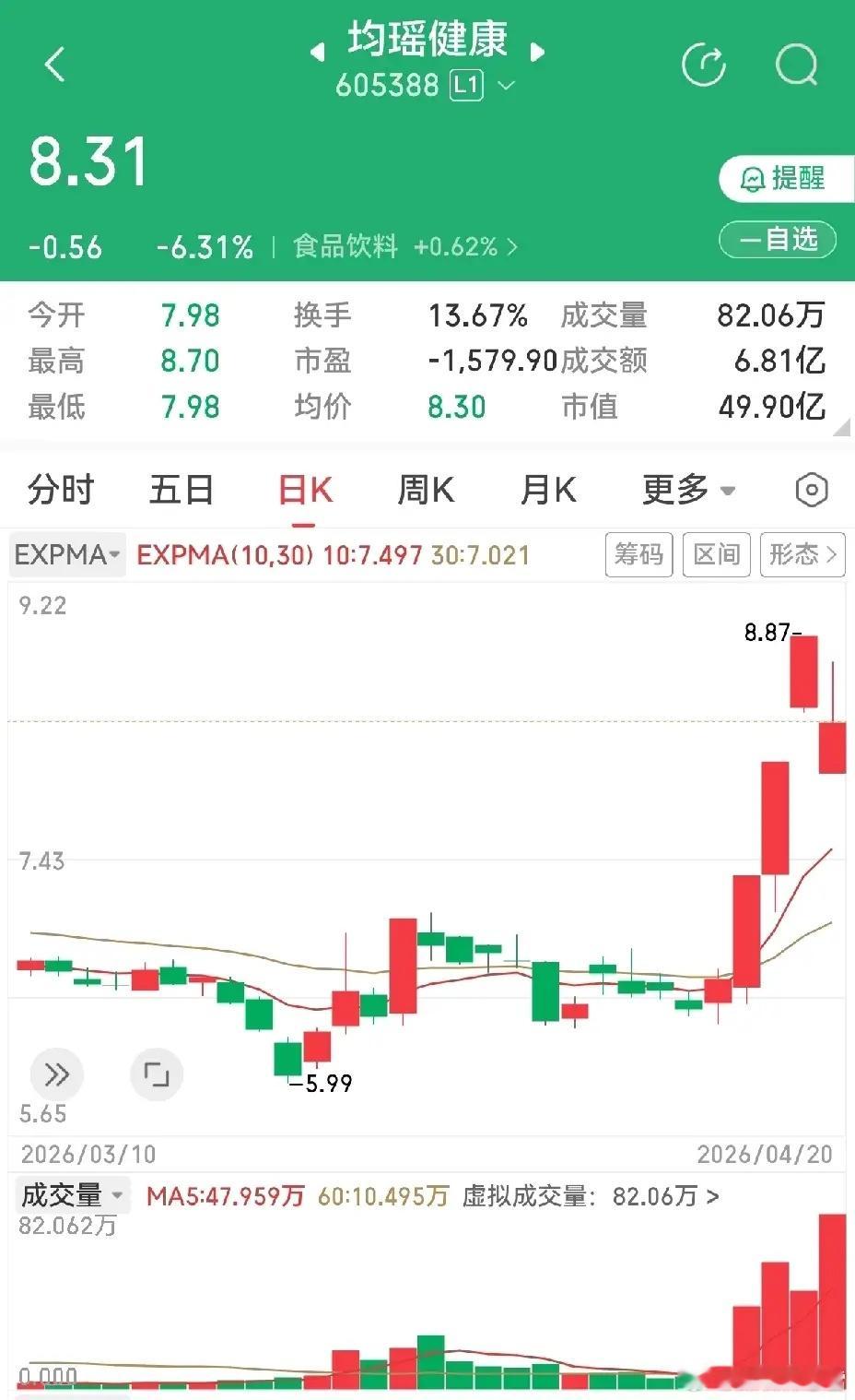 均瑶健康,三连板后回调,放量了,能从跌停板打开,并以-6.31%收盘,没有再度跌停,是不是可以理解为有较大的承接盘呢?这里的假阳真阴,还是需要多观察,会不会是主力诱多呢?