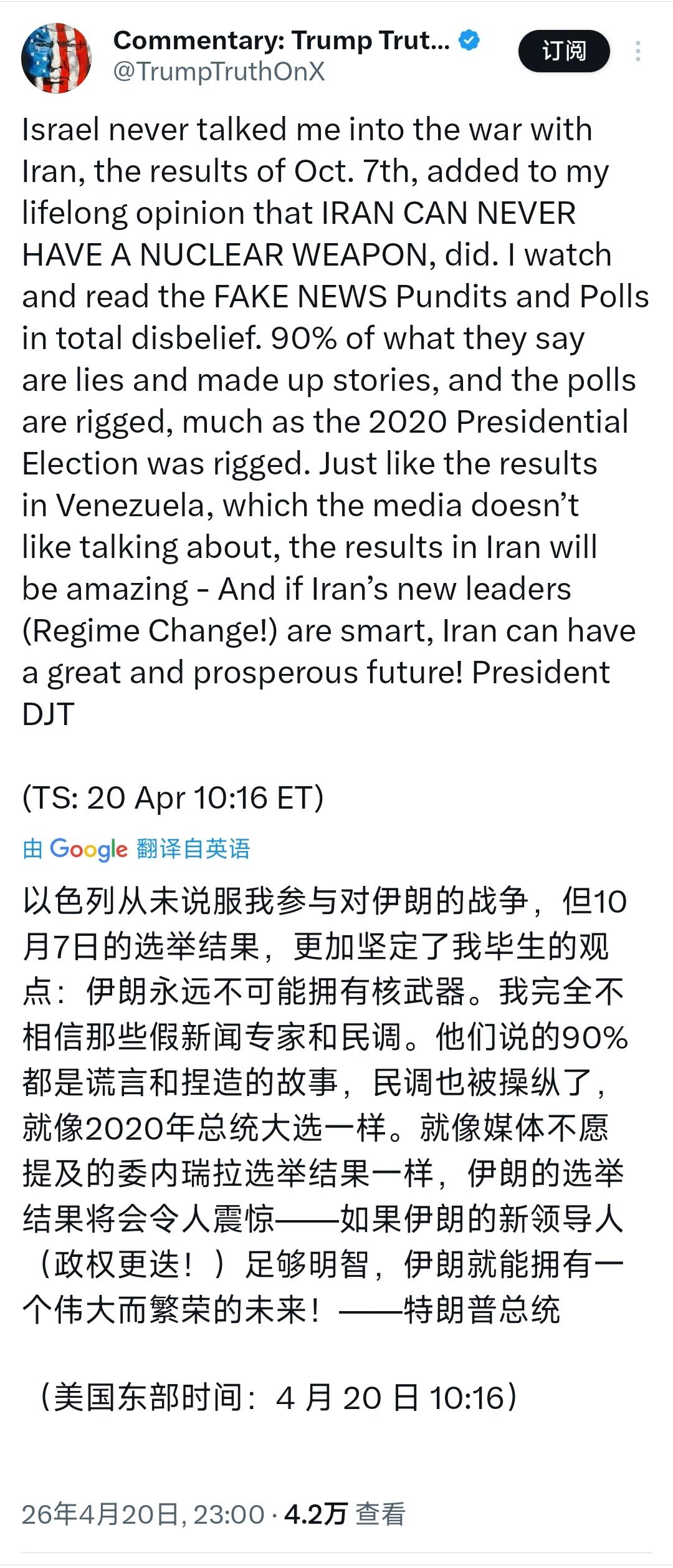 特朗普昨晚(北京时间4月20日晚)写道:“以色列从未说服我参与对伊朗的战争,但10月7日的结果,更加坚定了我毕生的观点:伊朗永远不可能拥有核武器。我完全不相信那些假新闻专家和民调。他们说的90%都是谎言和捏造的故事,民调也被操纵了,就像2020年总统大选一样。就像媒体不愿提及的委内瑞拉选举结果一样,伊朗的选举结果将会令人震惊——如果伊朗的新领导人(政权更迭!)足够明智,伊朗就能拥有一个伟大而繁荣的未来!”