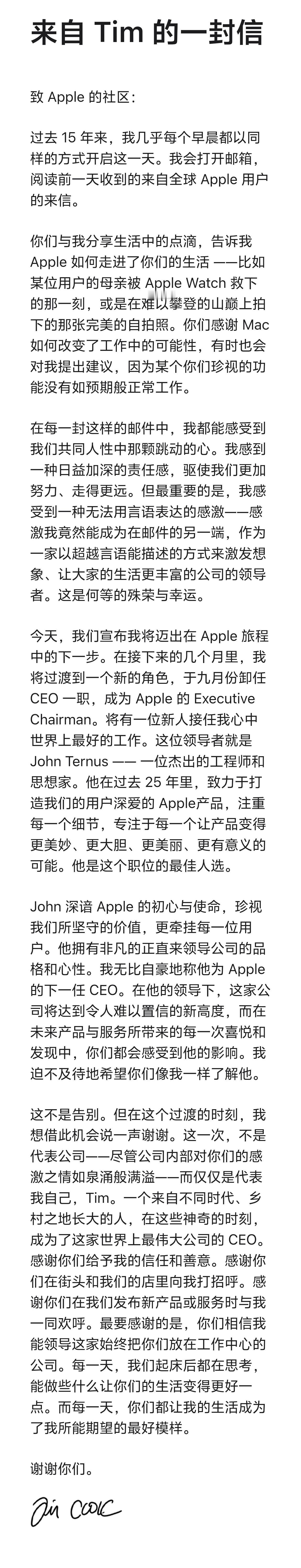 苹果官方宣布,蒂姆·库克将转任董事会执行主席,硬件工程高级副总裁约翰·特努斯将于9月1日接任首席执行官一职