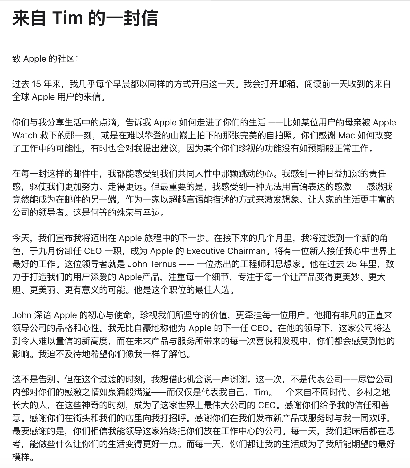 Tim Cook今天发了封公开信,宣布9月1日卸任CEO转任Executive Chairman。接任的是现任硬件工程高级副总裁John Ternus。这是Apple自2011年以来第一次换CEO。
