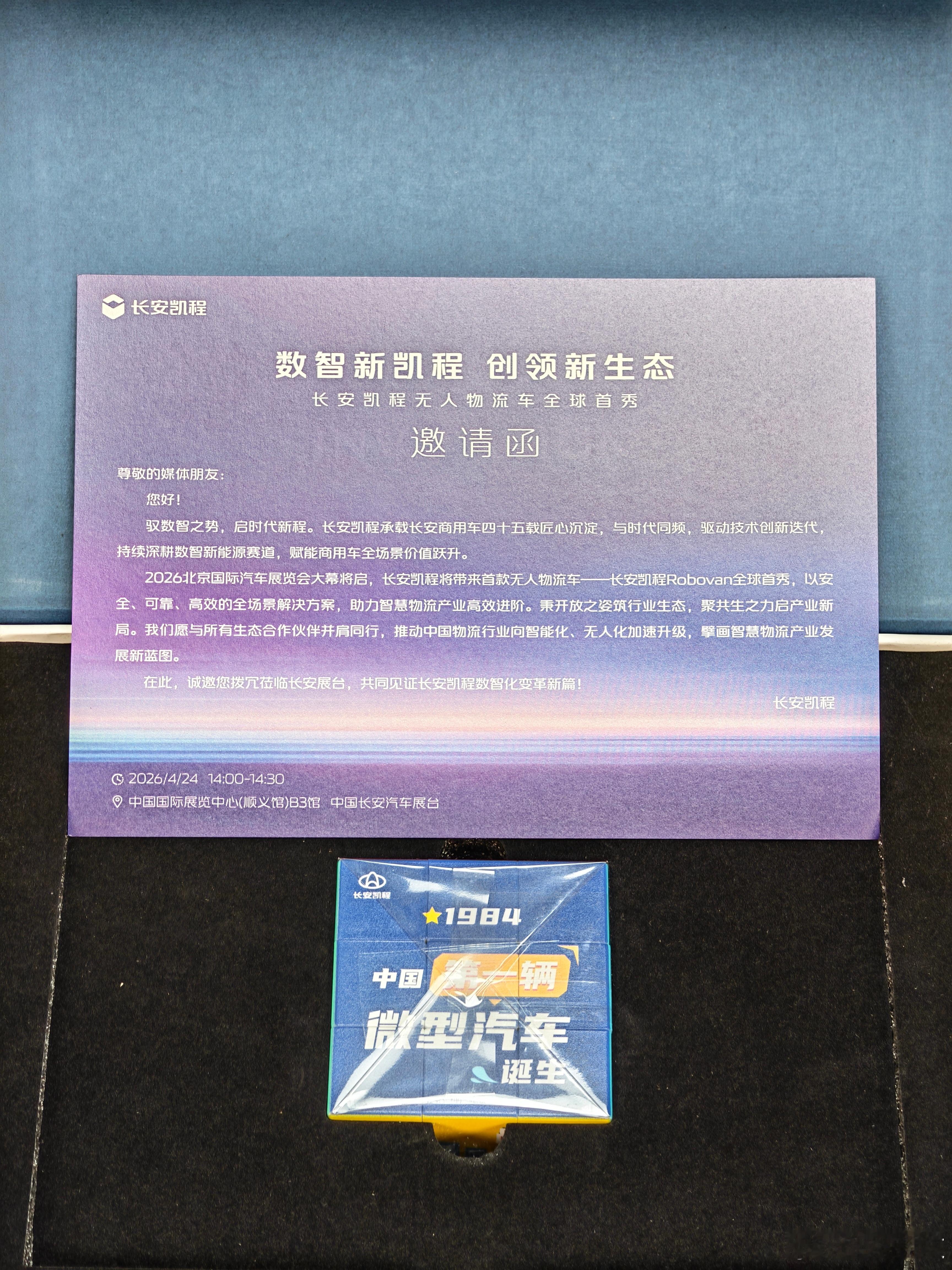 刚收到长安寄来的车展邀请函,居然是个定制魔方,创意直接拉满!转动每一面,都是长安凯程的硬核里程碑:1984诞生中国首台微型汽车,1999关键一撞挽救微车命运,2003推出最早凸头安全微卡,2024数智立方新标发布,2025新央企长安正式挂牌,2026国家队进军无人物流车领域。长安坐拥164年工业底蕴、45年造车实力,去年启动双标战略,今年以新央企姿态全面焕新!2026北京车展长安凯程无人物流车将重磅亮相,这也是长安凯程Robovan全球首秀,到时候一起见证国家队的科技实力!数智新凯程 创领新生态智慧伙伴 一路凯程国之长安 智启全球智驾数码团