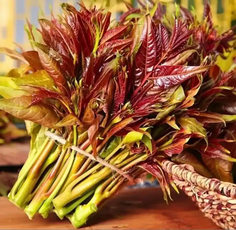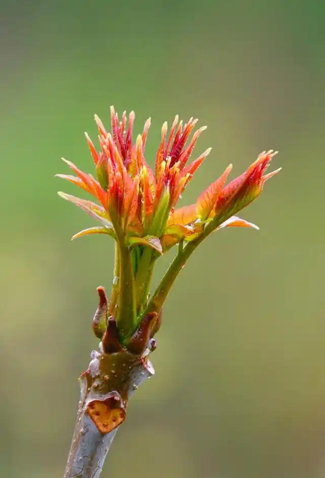于是不得不找网上香椿芽的图片来个实打实的对比。你看人家长得样子,都长在树梢的顶端,而且都是长在一条直挺挺的独枝上头。