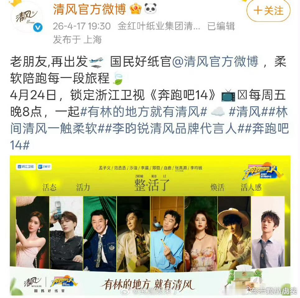 恭喜李昀锐和清风品牌续约了,品牌还给《奔跑吧》投广了 ,就这样宠爱代言人👏