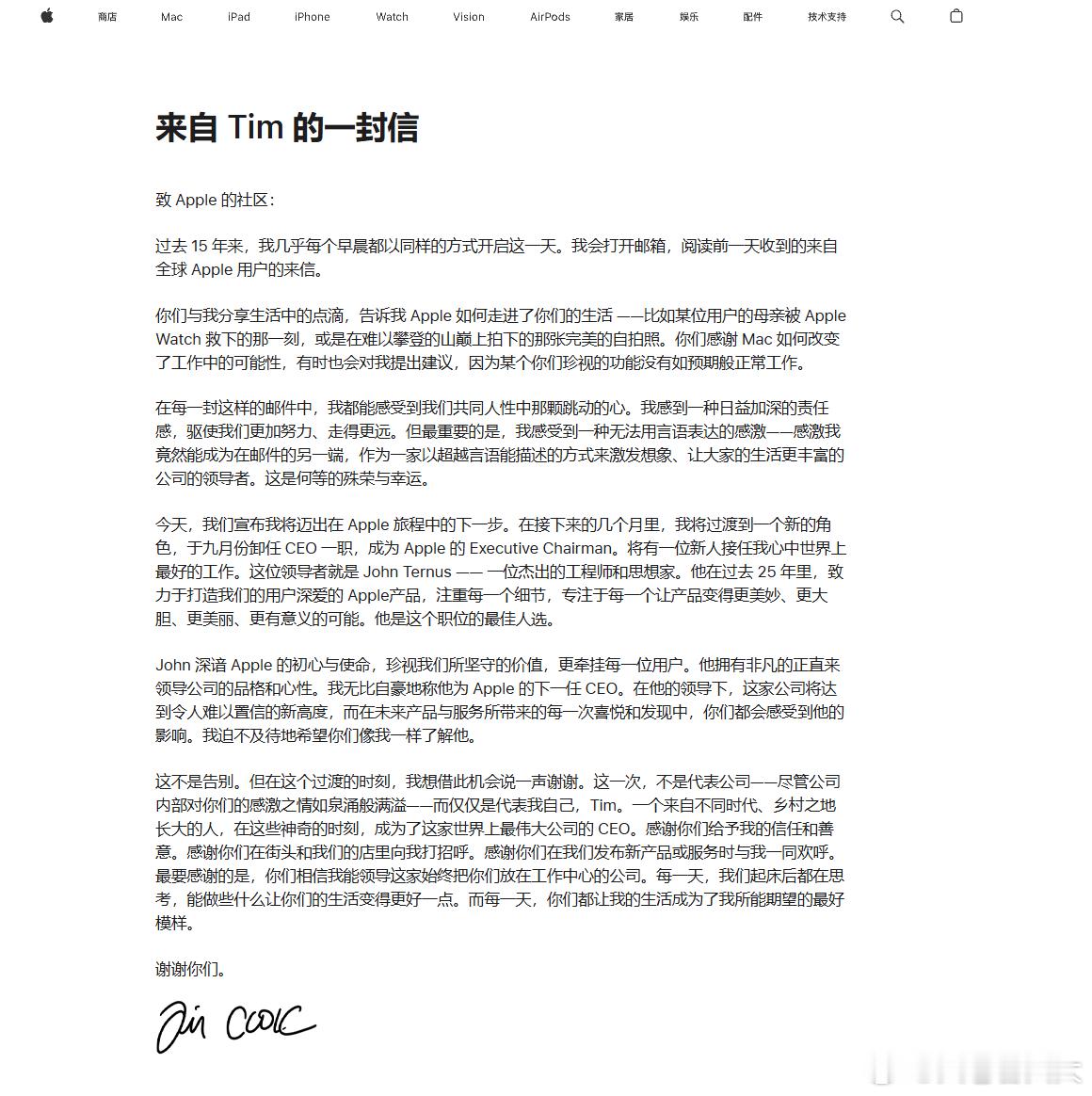 他称特努斯是一位杰出的工程师与思想家,在过去25年里致力于打造用户深爱的苹果产品,注重每一个细节,专注于每一个让产品变得更美妙、更大胆、更美丽、更有意义的可能,是CEO职位的最佳人选。