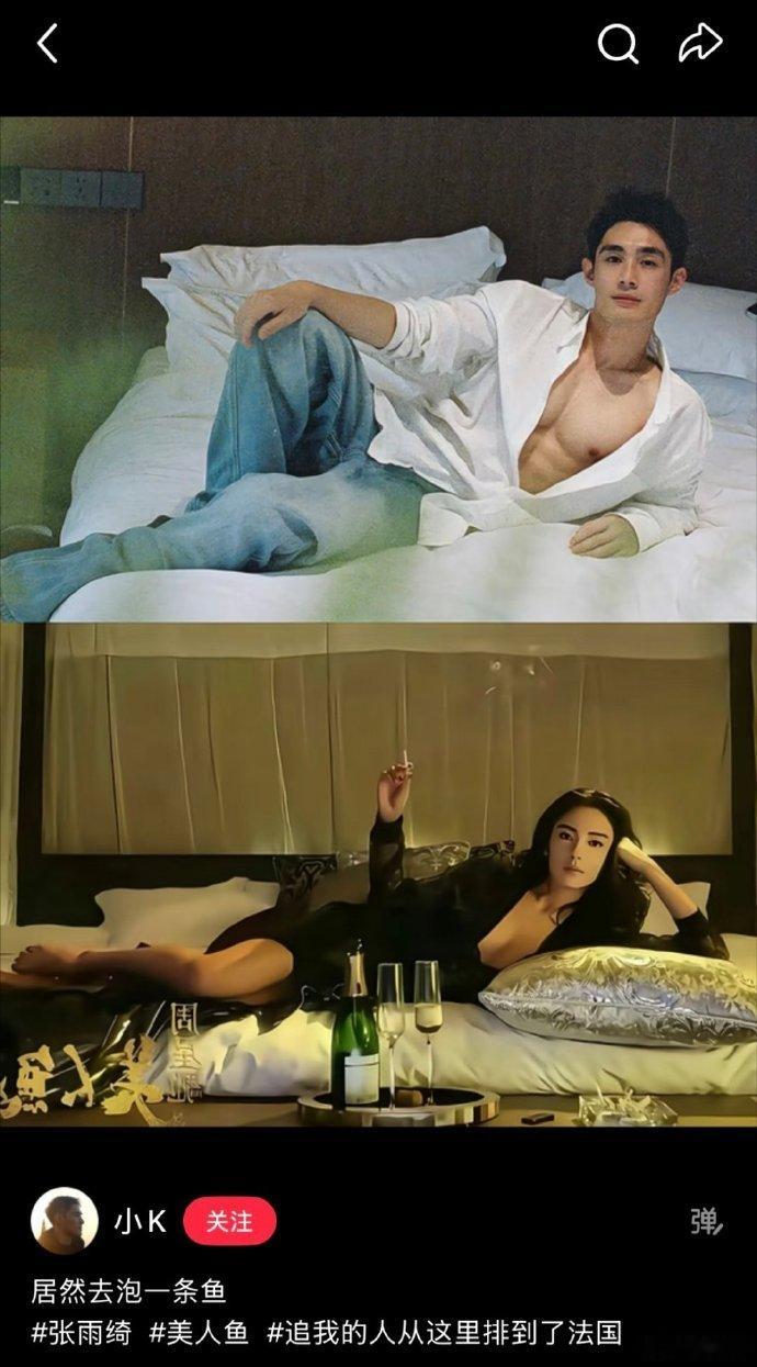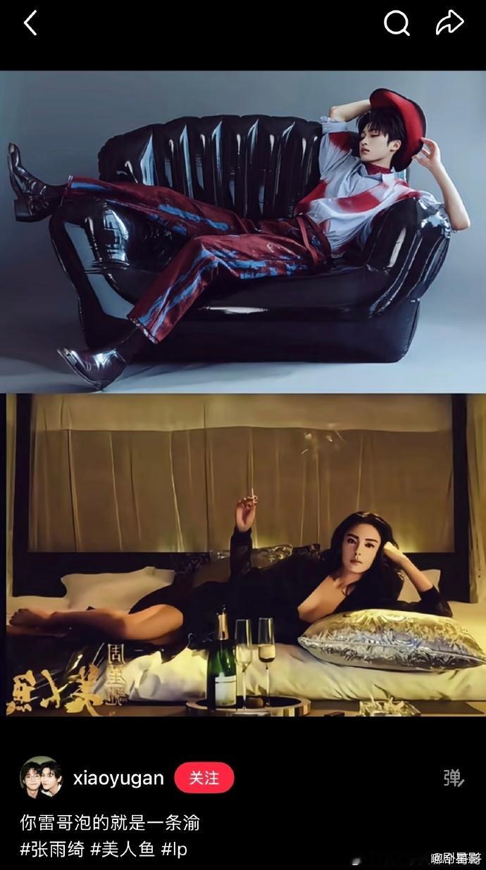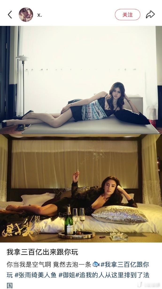 张雨绮美人鱼经典pose又火了张雨绮美人鱼pose被网友复刻 大家真的是太会玩了呀,看到张雨绮美人鱼pose被网友复刻,咱们姐这么经典的pose,这一次又火了~