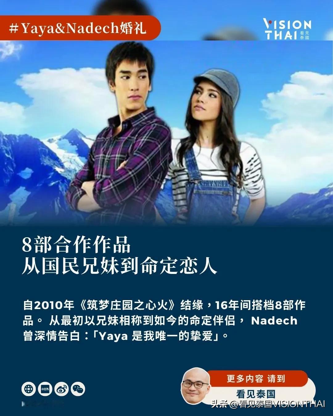 回顾两人的缘分,这对郎才女貌的顶级影星自2010年合作泰剧《筑梦庄园之心火》后便开启了深刻的连结,随后多达8部作品的搭档,让他们成为观众心中不可取代的屏幕情侣。两人起初虽以兄妹相称,但随后感情明显升温,Nadech过去受访时更毫不避讳地大方告白,直言Yaya就是他的挚爱与唯一想要结婚的人,证实了这段国民恋情。