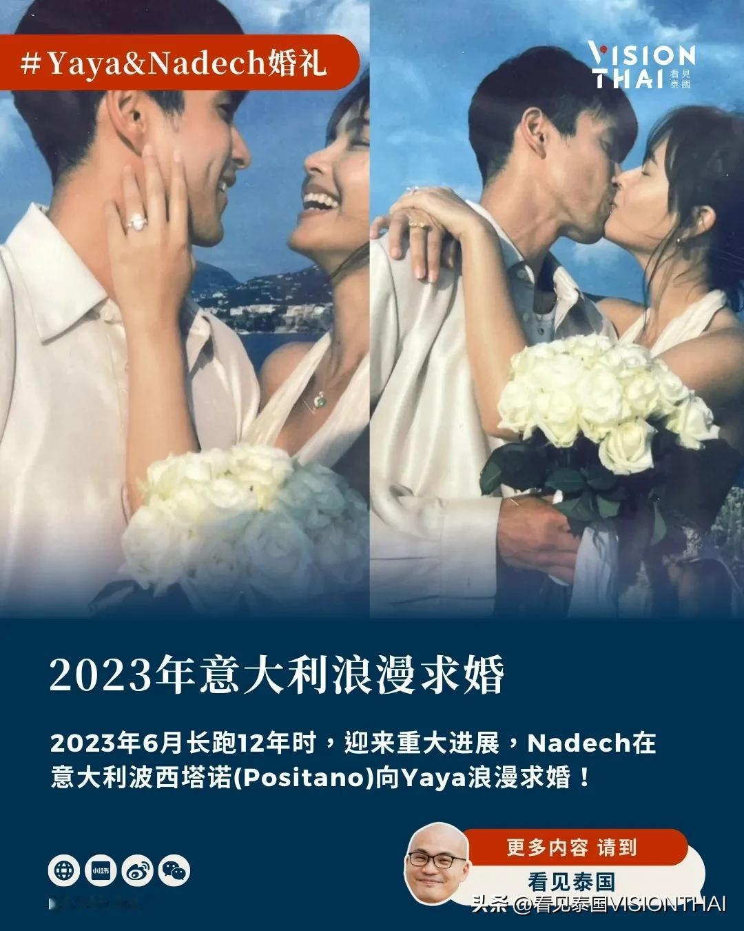 这段长跑终于在2023年6月迎来重大进展,Nadech在意大利波西塔诺(Positano)浪漫求婚后,于今年17日在孔敬府遵循传统仪式完成终身大事。