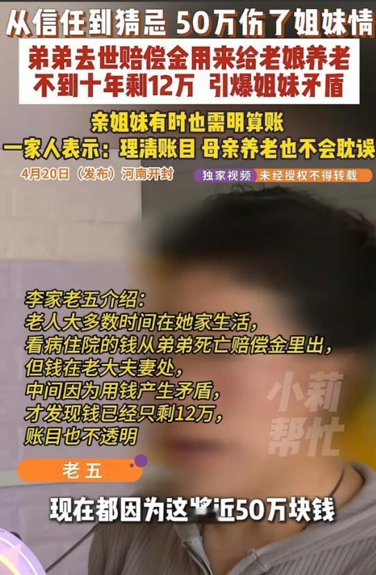 “在金钱面前,亲情啥都不是!”河南开封,男子去世,留下49.7万的赔偿金,他的5个姐姐商量,这笔钱是弟弟拿命换来的,谁都不能花,谁都不能用,给母亲留作养老金。10多年后,老母亲需要用钱,姐妹几人去取钱,却发现卡上只剩下不到12万了,查看流水后发现,赔偿金前脚到账,后脚就被大姐分两次取出36万。