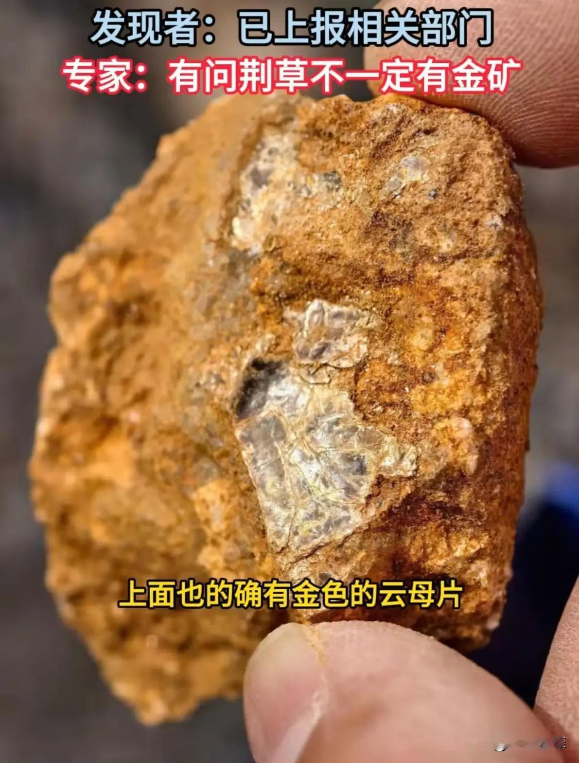 父子俩又在附近找,发现周围五公里基本上都是问荆草,他们还捡到一些石头,金色的,表面闪闪发亮。再用AI识别:是云母石,也是金矿附近常见的石头。