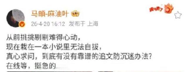 马頔求问有没有追文防沉迷办法马頔读小说台词中二病犯了歌手马頔近日在社交平台分享了自己的阅读近况,因沉迷追文难以控制节奏,特意发文询问有效的防沉迷方式。他在分享时还现场念出小说台词,情绪投入语气连贯,自带独特的节奏感,与大众印象中文艺内敛的形象形成鲜明反差,也让不少人看到了他私下里更鲜活的一面。