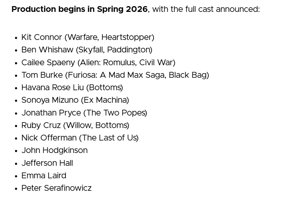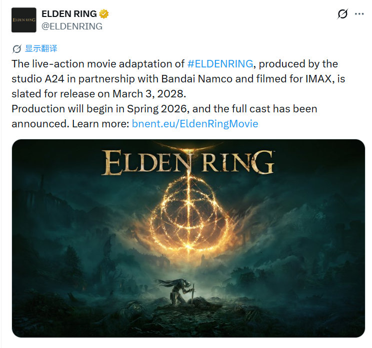 《艾尔登法环》改编真人电影官宣将于今年春季开机,由 A24与万代南梦宫合作制作,计划于2028 年3月3日上映,本作由亚历克斯·加兰担任导演与编剧,基特·康纳、本·韦肖等演员参演。艾尔登法环电影法环电影演员阵容