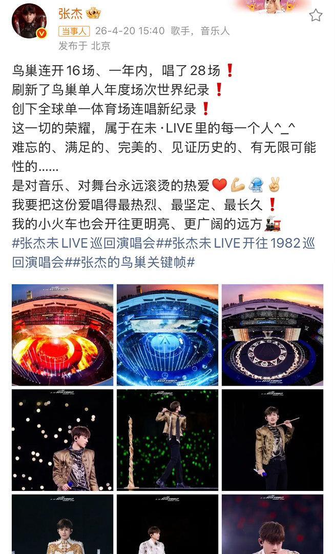 张杰16场鸟巢演唱会收官发文恭喜张杰鸟巢16场圆满收官!能在鸟巢开这么多场还破纪