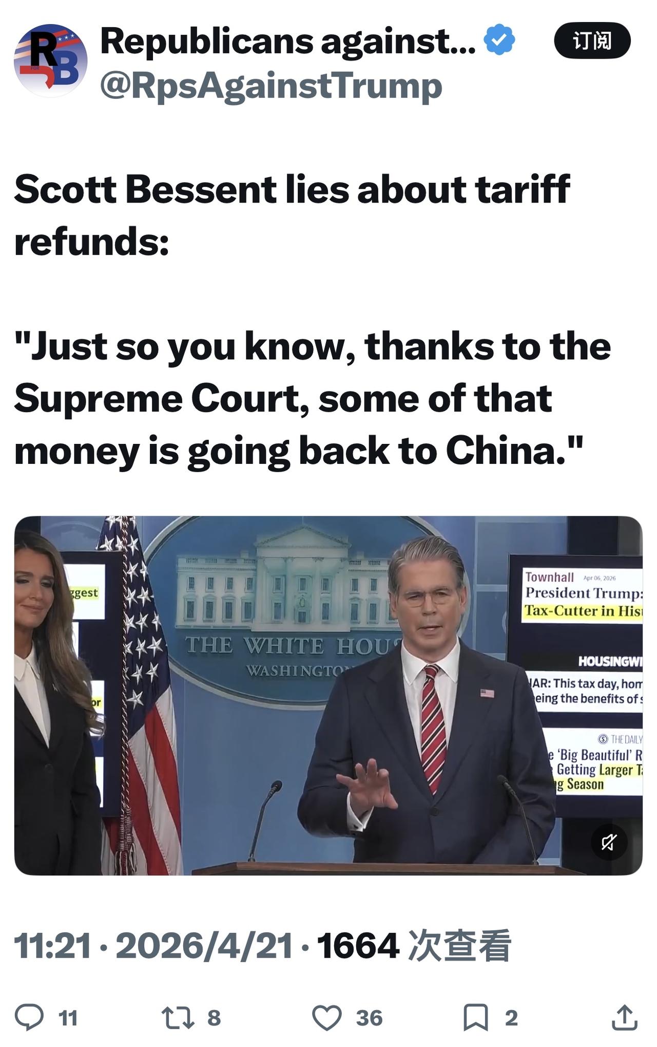 美国财政部长斯科特·贝森特在关税退款问题上公然撒谎: