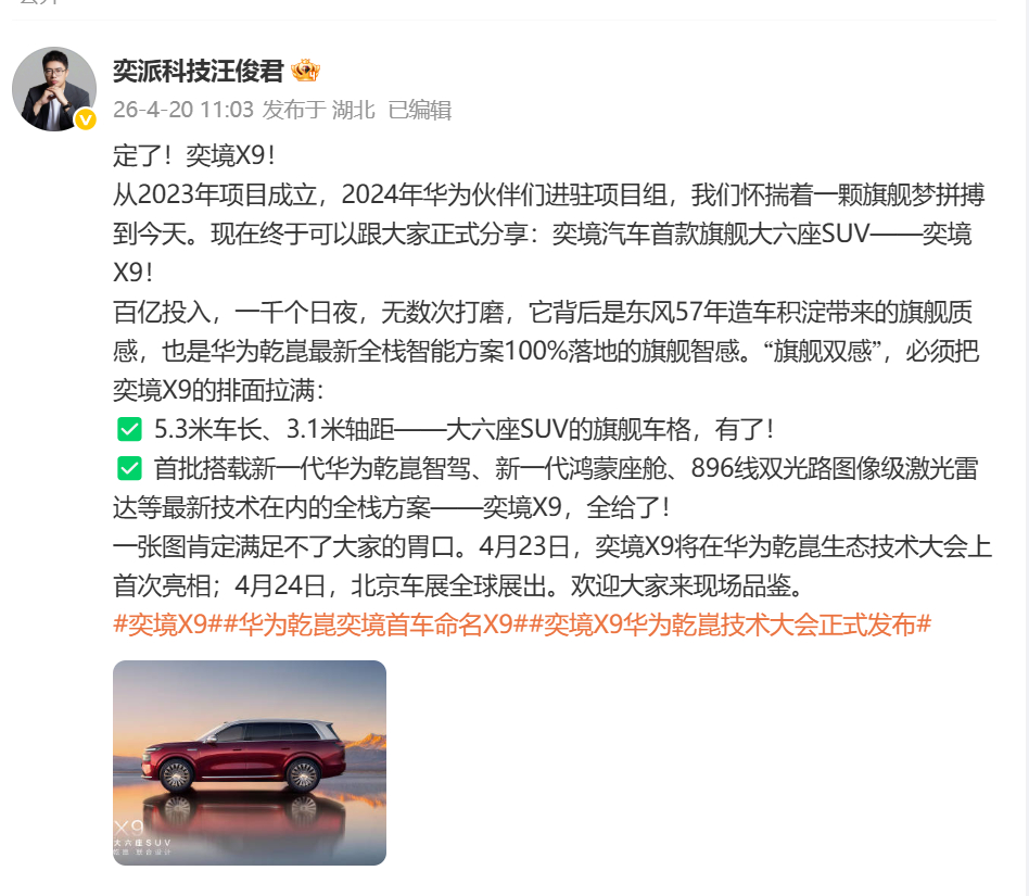 昨天刷到奕境X9官宣定名的消息,其中的信息量其实挺大的。