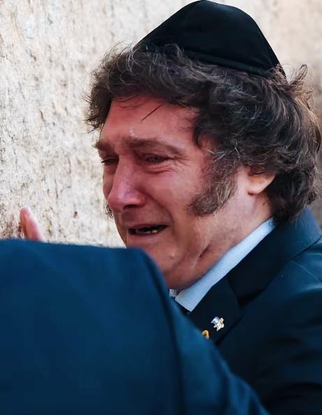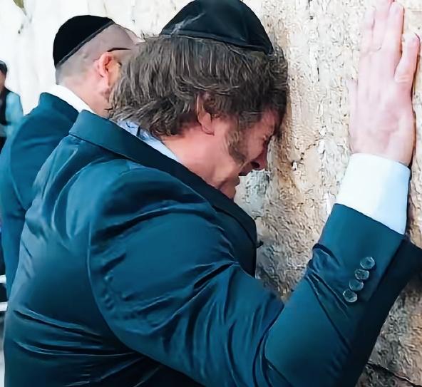 在耶路撒冷的哭墙前,阿根廷总统米莱头贴着石墙,双手扶着壁,肩膀不停地抽动着,眼泪